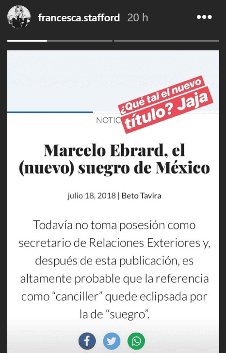 Hasta ahora, la hija mayor del virtual próximo canciller de México, Marcelo Ebrard, no había aparecido en la escena pública al menos relacionada con su padre, pero el sitio cunadegrillos.com relata algunos detalles hasta ahora poco conocidos de la hija del político mexicano."Se llama Francesca Sophie. Ronda los 30 años de edad. Está soltera y es la primera de los tres hijos que tuvo Marcelo Ebrard con su esposa Francesca Ramos Morgan", relata la nota con la que se ponen los reflectores sobre esta nueva personalidad del mundo de redes.En su cuenta de Instagram, "Francesca Stafford" se describe como actriz graduada de la Vancouver Film School pero también mantiene como parte de su biografía su formación como psicóloga, que según el sitio "Cuna de Grillos" habría estudiado en la Universidad Anáhuac del Norte.Pese a su "bajo" perfil y desvinculación con la carrera política de Marcelo, Francesca ha dejado entrever que sí está cerca de los círculos de poder, pues el 2 de julio pasado (1 día después de las elecciones federales) publicó una imagen junto con Andrés Manuel López Obrador y el mensaje: "Con el próximo presidente de México, Manuel López Obrador. Noche histórica" (ella lo escribió en inglés). A través de una publicación de Instagram Stories la propia Francesca ha reaccionado a la publicación que ahora la pone debajo de los reflectoresEn su perfil de la red social, Francesca Stafford no tiene reserva en mostrarse en poses sensuales, disfrutando viajes al extranjero y diversos lujos.