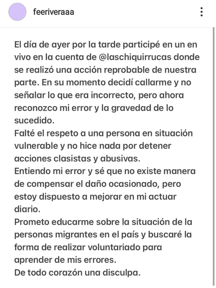 Luego de la publicación del comunicado emitido por FM4 y Casa Migrante Saltillo, en redes sociales donde evidenciaban a tres “influencers” locales por vulnerar a un migrante al ofrecerle un billete de 500 pesos falso por dejarse tocar los genitales, y a uno más por haber sido participe en otro momento, los llamados “Chiquirrucas” ofrecieron disculpas en sus cuentas de Instagram.@jcvillalobosjc, publicó: “El día de ayer (domingo) mi conducta fue totalmente incorrecta, reconozco el gran error que cometí y me arrepiento de lo sucedido. Estoy dispuesto a aprender de ello, buscando la manera de educarme, sensibilizarme y trabajar en mi empatía y mis errores. Esto no es para justificarme, es para reconocer que mis actos no fueron correctos y estoy consciente de ello. Reitero mi disculpa, estas acciones no volverán a suceder”.Las disculpas llegaron horas después de que los usuarios de redes sociales criticaran las acciones cometidas por este grupo de amigos. Personalidades como los youtubers Pepe y Teo, condenaron lo sucedido.En otro comunicado emitido por el usuario feeriveraaa se lee: “El día de ayer por la tarde (domingo), participé en un en vivo en la cuenta @laschiquirrucas donde se realizó una acción reprobable de nuestra parte. En su momento decidí callarme y no señalar lo que era incorrecto, pero ahora reconozco mi error y la gravedad de los sucedido”.Y continúa, “falté el respeto a una persona en situación vulnerable y no hice nada para detener acciones clasistas y abusivas. Entiendo mi error, y sé que no existe manera de compensar el daño ocasionado, pero estoy dispuesto a mejorar en mi actuar diario. Prometo educarme sobre la situación de las personas migrantes en el país y buscaré la forma de realizar voluntariado para aprender de mis errores. De toco corazón, una disculpa”.Previamente, el primero en pronunciarse al respecto fue @charlie_daguinaga, quien no participó en los actos que condenó FM4 el pasado domingo, pero sí se refirió en el comunicado emitido, que en otro momento había estado presente en una situación similar. Este influencer estaba en Monterrey cuando sucedió el hecho.“Todo lo viví desde allá, voy llegando a Guadalajara, y pues solo quiero dejar en claro mi postura ante esto, creo que son acciones súper reprobables, estoy súper en contra de este tipo de acciones, creo que lo que pasó ayer es algo que no debe de pasar y está sumamente mal. Sé que estoy involucrado en esto por acciones que ya fueron en el pasado, esto no quiere decir que estuviese de acuerdo con que pasaran en ese momento, pero mi ignorancia me llevó a no hacer más nada. Tomo mi responsabilidad por esto, me he educado con el tema, deseo seguir haciéndolo, definitivamente no soy la persona que era hace unos años o que inclusive era ayer”.La declaración completa a continuación:Si te interesó esta noticia y quieres saber más, entonces descarga y descubre INFORMAPlus, la aplicación digital de EL INFORMADOR, en donde tenemos contenidos exclusivos, seleccionados por nuestros editores, para darles una experiencia más completa a los lectores.Descarga la aplicación y pruébala GRATIS por treinta días.Para iOS: https://apple.co/35jaVgbPara Android: https://bit.ly/3gwVSEVSi eres suscriptor de EL INFORMADOR tu acceso está incluido, solicítalo al 33 3678-7777MB