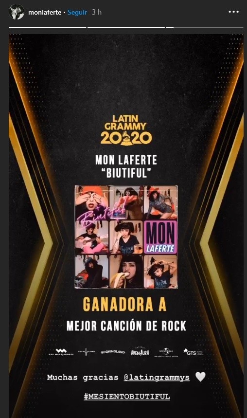Mon Laferte lo hace una vez más. Por segundo año consecutivo la cantautora es reconocida por La Academia Latina de la Grabación y se lleva a casa el galardón a la “Mejor Canción de Rock” por “Biutiful”, en la 21.a edición del Latin Grammy.En el festejo a lo mejor de la música latina, que se realizó este jueves 19 de noviembre, desde Miami, Florida, Mon Laferte se corona como una de las cantantes más importantes hoy en día, a la par que se encuentra dentro de las primeras posiciones de las listas de popularidad en toda Latinoamérica con su tema “Que se sepa nuestro amor” junto a Alejandro Fernández.'“Biutiful”, es una declaración de amor propio. Es una gran sorpresa este premio, la canción y el vídeo surgieron durante el confinamiento en cuarentena de forma muy orgánica, la idea principal es que una puede sentirse bien de cualquier manera. La belleza es una cosa de actitud ¡no necesitamos nada más! Muchísimas gracias a La Academia y compañeros músicos que hicieron esto posible”, señaló Mon Laferte.Cabe recordar que el año pasado la cantante ganó su segundo Latin Grammy en la categoría "Mejor Álbum de Música Alternativa" por su disco “Norma”, ya que en 2017 fue la primera vez que Mon Laferte consiguió este prestigiado premio gracias al tema “Amárrame”.JB