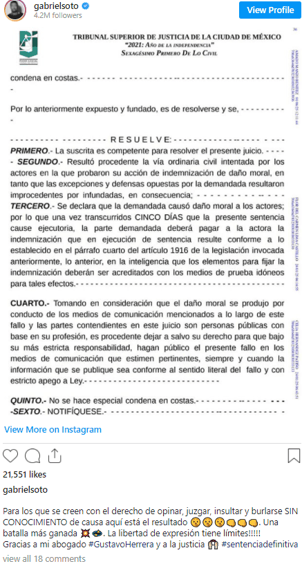 La conductora Laura Bozzo sufre un nuevo revés, porque a todos los problemas legales que tiene por defraudación fiscal, se suma la indemnización que deberá realizar a favor de Gabriel Soto e Irina Baeva, quienes la demandaron el año pasado por difamación, acoso y amenaza.El actor dio a conocer a través de su cuenta de Instagram, el fallo del juez que obligará a la peruana a resarcirles el daño, por haberse expresado de mala manera sobre ellos en un programa de televisión en los Estados Unidos, llamando a Gabriel como "el desgraciado del año", además de calificativos ofensivos para Irina."Para los que se creen con el derecho de opinar, juzgar, insultar y burlarse sin conocimiento de causa aquí está el resultado. Una batalla más ganada. La libertad de expresión tiene límites!!!!!", escribió Soto en su publicación, que estaba acompañada de una foto del documento legal.Esto sucedió días después de haberse realizado una audiencia para desahogo de pruebas en el Tribunal Superior de Justicia de la Ciudad de México, a la cual ni Laura Bozzo, ni sus abogados llegaron, pero sí Gabriel e Irina, quienes junto a su equipo legal, demostraron que su demanda sí tenía sustento."El objetivo es precisamente marcar un precedente de que no se puede denigrar de esa forma, no pueden utilizar ese tipo de lenguaje contra de alguien, contra de nosotros, en este caso en televisión internacional, denigrando nuestra reputación y nuestra dignidad, llamándonos de una forma que ni viene al caso", expresó el actor. "Se marcó ya el precedente para que exista un respeto entre la gente que está detrás de los micrófonos y tiene el poder de opinar. Siempre hay un límite en la libertad de expresión", dijo Gabriel Soto.Hasta el momento no se ha dictado sentencia, ni de qué manera se realizará la indemnización, que podría ser desde una cantidad monetaria a una disculpa pública, aunque Gabriel Soto asegura que su mayor interés es que se tenga un precedente en casos como el suyo.AF