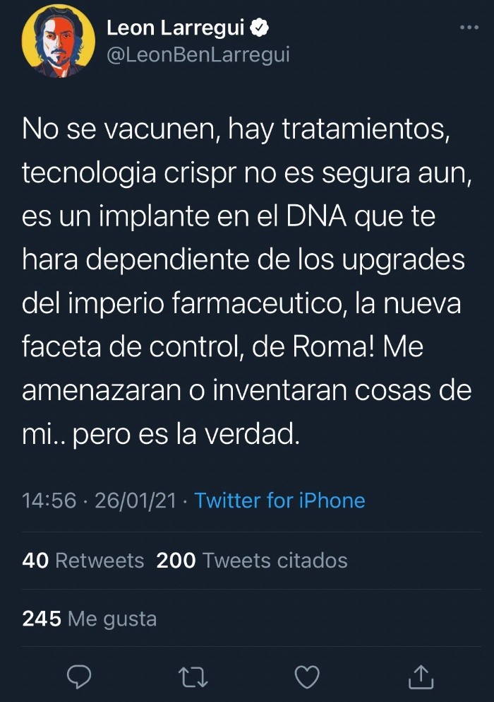 La cuenta de Twiiter de León Larregui fue eliminada por la plataforma después de una publicación que hizo donde desinforma y promueve no vacunarse contra el COVID-19 porque es una "faceta de control".En la red social el cantante señaló que "hay tratamientos; tecnología crispr no es segua aun, es un implante en el DNA que te hará dependiente de los upgrades del imperio farmaceútico".El tuit de inmediato generó reacciones por parte de los usuarios, sin embargo la cuenta del vocalista de Zoé fue eliminada por hacer una declaración falsa sobre la vacuna.Recientemente la red social Twitter actualizó sus condiciones de uso sobre los temas de la pandemia de COVID-19 y la vacunación y señalaron que "ampliaremos la política y es posible que solicitemos a las personas que remuevan los Tweets que presentan narrativas dañinas, falsas o engañosas sobre las vacunas COVID-19".Algunas de larestricciones son:jb