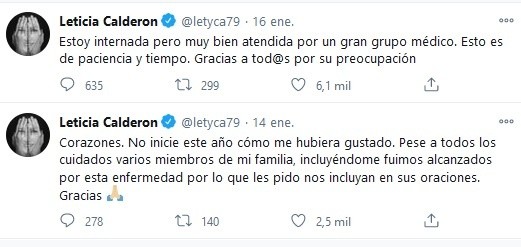 La salud de la actriz Leticia Calderón, quien se encuentra hospitalizada por complicaciones del COVID-19, es buena, explicó Yadhira Carrillo.La también actriz fue cuestionada al captarla en su visita al Reclusorio Norte de la Ciudad de México, a donde acudió a ver a su marido Juan Collado, exesposo de Calderón."Está bien, es cuestión nada más de paciencia, de tiempo, como es esto, pero está perfectamente bien atendida”, dijo a las cámaras del programa "Despierta América".Además explicó que Collado (quien lleva más de un año en la cárcel) sabe el estado de su exmujer quien se mantiene monitoreada por gente cercana, mientras que a los hijos de Leticia los está cuidando uno de sus familiares."Está muy pendiente. Los niños están bien y Juan está en contacto como todos los días vía telefónica", señaló."Estamos muy pendientes y con toda la fe de que esto va a salir como queremos, que salga, que esté con salud y que esté muy pronto afuera feliz y contenta", dijo Yadhira.La actriz de telenovelas también compartió que de su parte nunca ha tenido diferencias con Calderón por ello siempre le ha deseado lo mejor. Fue la propia Leticia quien informó hace unos días a través de Twitter que había dado positivo al coronavirus y el 16 de enero es que fue hospitalizada."Estoy internada, pero muy bien atendida por un gran equipo médico. Esto es de paciencia y tiempo. Gracias a todos por su preocupación", escribió.jb
