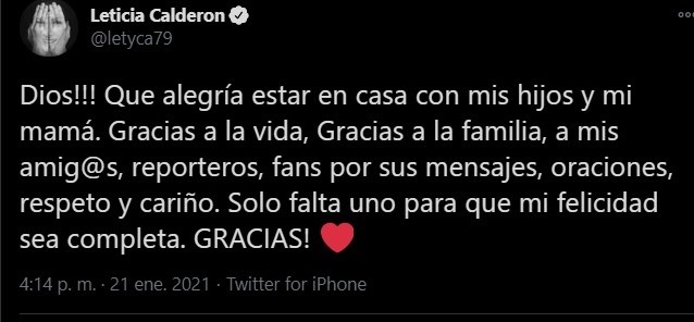 Leticia Calderón ya se encuentra en su casa con sus hijos y su mamá tras estar unos días en el hospital por el COVID-19.Calderon, de 52 años, agradeció el apoyo y las oraciones de sus seguidores, e informó que ya sólo falta un familiar por sanar para que su felicidad sea completa."Dios!!! Que alegría estar en casa con mis hijos y mi mamá. Gracias a la vida, Gracias a la familia, a mis amig@s, reporteros, fans por sus mensajes, oraciones, respeto y cariño. Solo falta uno para que mi felicidad sea completa. GRACIAS!", se lee.Calderón y varios integrantes de su familia se contagiaron de COVID-19, ella tuvo que ser hospitalizada; en su momento, pidió a sus fans rezaran por ella.A Lety le tocó ver desde el hospital el final del melodrama "Imperio de Mentiras", en donde participó. A través de sus redes le dio seguimiento al final de esta historia, y recibió aplausos de sus seguidores por su "excelente actuación".AC