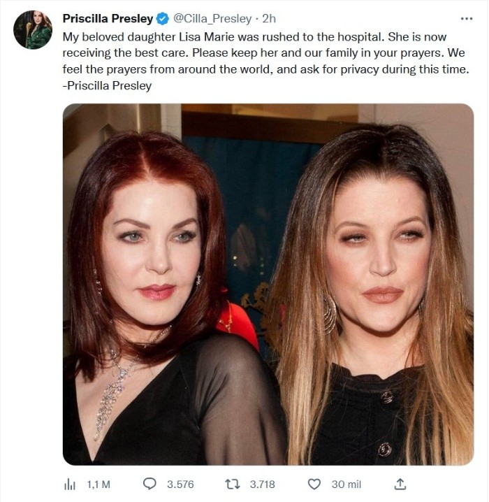 La muy conocida celebridad Lisa Marie Presley, la única hija de Elvis Presley ‘El Rey’, murió este jueves 12 de enero luego de haber sido trasladada de emergencia al hospital tras sufrir un paro cardíaco, según dieron a conocer fuentes cercanas a la actriz y medios del vecino país, quienes coinciden que que los paramédicos lograron resucitarla a través de RCP en su casa de Calabasas, California, para ser llevada posteriormente a un puesto de socorros.De este modo, durante las horas posteriores a su hospitalización, no se tenían detalles acerca de su condición de salud, pero se sabe que estaba siendo tratada por médicos. Más tarde, después de que se reportara que su condición era crítica, fuentes cercanas a la familia de Priscilla Presley confirmaron a diferentes medios que la también cantante había fallecido.En este sentido, la última aparición pública de quien fuera asimismo esposa de Michael Jackson (de 1994 a 1996) fue este pasado martes, durante la gala de los Golden Globes, a la que fue acompañada por su madre, la también actriz Priscilla Presley; un evento en el que estuvieron presentes para atestiguar el triunfo de Austin Butler en la categoría Mejor Actor gracias a su interpretación de ‘El Rey del Rock’ en el largometraje sobre la vida del intérprete de rock que dirigió Baz Luhrman este año.JM