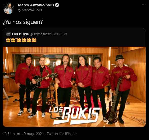 Los Bukis, liderados por Marco Antonio Solis, regresaron luego de 25 años separados. El anuncio lo dio a conocer Solis en redes sociales luego de la presentación del concierto para el Día de las Madres “Bohemia en Pandemia”.“¿Ya nos siguen?”, escribió Marco Antonio Solis en Twitter, y adjuntó una fotografía donde se puede ver a los músicos.Solis dio la sorpresa del reencuentro durante su concierto virtual como el estelar de la noche de este domingo 9 de mayo.Joel Solis, Eusebio Cortéz, Roberto Guadarrama, Pedro Sánches, José Javier Solis y, por supuesto, Marco Antonio Solis fueron vistos en la transmisión para interpretar el éxito “Tu Cárcel”.Tras la noticia, Marco Antonio Solis “El Buki”, abrió una cuenta de Twitter e Instagram para la banda. Cuentan con más de tres mil seguidores (Twitter ) y más de 10 mil en Instagram.Luego de 25 años de estar separados, Los Bukis se reencontraron la noche de este domingo. Sin embargo, sus éxitos Los Bukis se originaron en México en la década de los 70´s por Marco Antonio Solis y Joel Solis. La banda tuvo éxitos como “Falso”, “Tu Cárcel”, “Tus Mentiras” y “A donde vayas”, por mencionar algunas.El último concierto de Los Bukis se realizó en Guadalajara el 18 de mayo de 1996 luego de 20 años de éxito y dando paso a la carrera en solitario para Marco Antonio Solis.El reencuentro provocó algunas reacciones en redes sociales, donde fans celebraron la sorpresa con comentarios positivos y celebrando a las mamás.AC