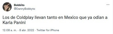 Después de ofrecer ocho conciertos en México, los integrantes de Coldplay han sido criticados por su larga estancia en el territorio mexicano.Usuarios de las redes sociales han compartido memes de la banda británica pues algunos señalan que "ya son tan mexicanos que hacen cosas características del país."Los de Coldplay" se hizo tendencia en la red social de Twitter por una gran cantidad de memes y comentarios sobre la banda.La agrupación liderada por Chris Martin se encuentra en México desde hace dos semanas. Durante ese tiempo han ofrecido conciertos en Monterrey, Guadalajara y la Ciudad de México como parte de su gira “Music of The Spheres”, título de su último disco.Durante la tercera fecha de sus conciertos en el Foro Sol, Chris Martin emocionó al cantar con una fan con discapacidad auditiva.Fue en la canción “Something Just Like This” que Marin y Coldplay subieron al escenario a una joven para interpretar un dueto en lengua de señas y sólo con el piano, un momento muy emotivo para algunos de los asistentes.JB