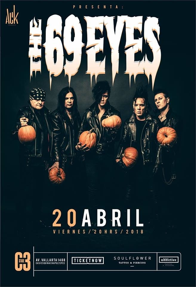 La agrupación de The 69 Eyes emprende su regreso a México luego de ocho años de ausencia y tendrán parada en nuestra ciudad el 20 de abril en el C3 Stage.Tras casi 30 años de vida los 'Vampiros de Helsinki', han coqueteado con géneros como el 'Doom', 'Glam', 'Gothic Metal' entre algunos otros, derivando en un propio sonido que en palabras de ellos es una "mezcolanza visual y sonica en escena entre The Doors y Motörhead". The 69 Eyes cuenta con 12 álbumes de estudio, son creadores del denominado "goth & roll" y estarán por primera vez en Guadalajara.Boletos: General $650 pesosBalcón solo 50 personas (Balcón + entrada preferencial + póster): $950 pesos Adquiérelos en Taquilla de C3 Stage, Tiendas Soulflower y en TicketNow México