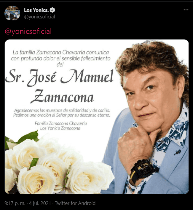 La tarde de este domingo se dio a conocer que José Manuel Zamacona, vocalista y líder de la agrupación Los Yonic's, falleció en la Ciudad de México a los 69 años de edad debido a complicaciones derivadas por el COVID-19.De acuerdo con el mánager de Los Yonic´s, Artemio Berdeja, José Manuel se contagió de COVID luego de vacunarse con las dos dosis; sin embargo, fueron las secuelas que le dejó la enfermedad las que impidieron una recuperación. José Manuel tenía más de 40 años de trayectoria en la música. Junto a Johnny Ayvar, fundaron la agrupación Los Yonic's en la década de 1970.Zamacona colaboró con artistas como Marco Antonio Solis, el grupo K-Paz de la Sierra y Mon Laferte.También participó en el reality de televisión “Bailando por un sueño”.Desde sus inicios en 1975, Los Yonic's grabaron 28 discos y José Manuel Zamacona se mantuvo en el grupo, aun con el cambio de algunos integrantes.AC
