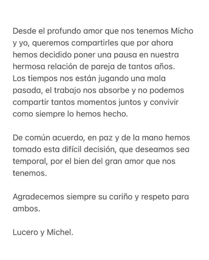 Lucero y Michel Kuri, tras una década de relación, han decidido darse una pausa y separarse, así lo informaron a través de un breve comunicado compartido en redes sociales.La cantante y el empresario disfrutaron de una década de amor sin casarse y sin vivir juntos, sin embargo, la intérprete de "El privilegio de amar" aseguró en reiteradas ocasiones que eso no afectaba su relación, al contrario. En el comunicado, aseguran que el tiempo les está jugando una mala pasada, pues debido a las ocupaciones y al trabajo de cada uno, son pocos los momentos que actualmente comparten juntos:"Desde el profundo amor que nos tenemos Micho y yo, queremos compartirles que por ahora hemos decidido poner una pausa en nuestra hermosa relación de pareja de tantos años, los tiempos nos están jugando una mala pasada, el trabajo nos absorbe y no podemos compartir tantos momentos juntos y convivir como siempre lo hemos hecho".En el escrito se agrega que la difícil decisión fue tomado por ambos, y que los dos esperan que la separación sea temporal: "De común acuerdo, en paz y de la mano hemos tomado esta difícil decisión, que deseamos sea temporal, por el bien del gran amor que nos tenemos. Agradecemos siempre su cariño y respeto para ambos".FS