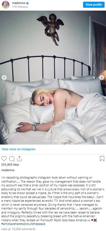 "Angel watching over me", fue la descripción que Madonna escribió en la publicación que hizo este miércoles en su cuenta de Instagram, una cuenta con más de 16 millones de seguidores y a quienes compartió diez fotografías que no solamente conmocionaron a los internautas, también generaron un intenso debate entre lo que debe o no publicarse en las redes sociales.La sexagenaria cantante aparece al interior de una recamara acostada sobre una cama con sábanas, almohadas y hasta un edredón color blanco, mientras, ella viste una atrevida lencería compuesta por unas medias de red que le llegaban a la parte superior del abdomen, una tanga y un sostén que prácticamente no dejaba nada a la imaginación, mismo que combinó con un collar con un dije de cruz, pulseras y unos tacones negros del diseñador Christian Louboutin por su característica suela de color rojo.Sin embargo, lo que más provocó la reacción de las personas es que las tomas estaban hechas con lo que definieron como "estilo porno", calificándolas de indignas y alarmantes.A pesar de que no es la primera vez que Madonna publica instantáneas atrevidas en sus redes sociales, esta serie de imágenes rápidamente alborotaron a los millones de seguidores de la cantante, así como a sus detractores, quienes no dudaron en llenar la caja de comentarios con opiniones dividas entre los que aplaudieron la publicación y la audacia de Madonna y, los que la criticaron por confundir Instagram con Pornhub."Esto se está poniendo un poco embarazoso ahora. Tus hijos deben estar muy orgullosos de ti, hemos visto mucho con el libro Sex y fue valiente entonces…"; "¿POR QUÉ MADONNA?… ¡Eres mejor que esto!"; "En lugar de hacer estas fotos ridículas, haz música de calidad como solías hacer"; "Tener respeto propio a esta edad te sentará mejor", fueron algunos de los comentarios negativos que recibió la que es mejor conocida como la "Reina del pop".AF