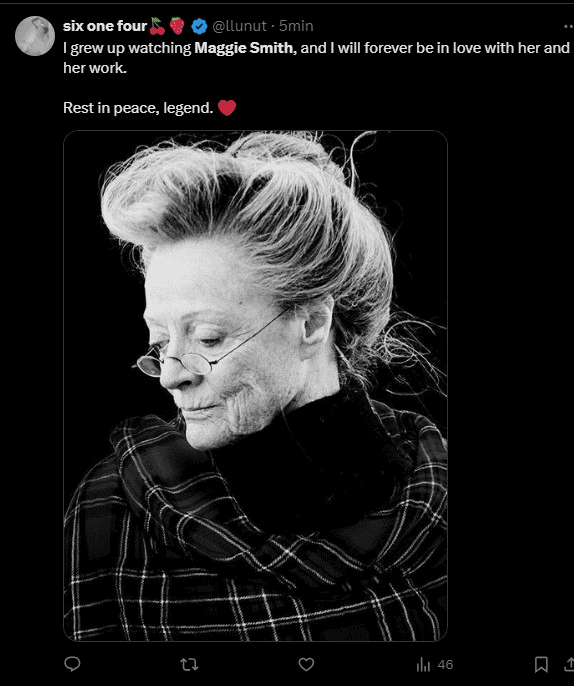 El día de hoy se anunció la muerte de la actriz británica Maggie Smith, quien tenía 89 nuevo años a la hora de su deceso. A través de un comunicado, su familia dio a conocer la lamentable noticia. En él sus hijos, Toby Stephens y Chris, Larkin precisaron que su muerte en el hospital fue pacífica."Con gran tristeza tenemos que anunciar la muerte de la dama Maggie Smith. Falleció pacíficamente en el hospital a primera hora de esta mañana, viernes 27 de septiembre. Era una persona muy reservada y sus amigos y familiares la acompañaron en el final. Deja dos hijos y cinco nietos cariñosos que están destrozados por la pérdida de su extraordinaria madre y abuela", señalaron.En su trayectoria actoral, Maggie Smith se ganó el corazón de muchos, pues su participación en la saga "Harry Potter" y la serie "Downton Abbey" la hicieron posicionarse como una de las artistas más icónicas del medio.Los fanáticos de "Harry Potter" rápidamente reaccionaron a la muerte de la actriz, emitiendo publicaciones donde recuerdan su trayectoria y le dirigen palabras de cariño y despedida.Maggie Smith nació el 28 de diciembre de 1934 en Ilford, Essex, en Gran Bretaña. Estudió actuación en el Oxford Playhouse School y debutó profesionalmente en 1952, en la película "Twelfth Night". Su carrera profesional está conformada por su participación en más de 60 películas y 70 obras teatrales.Desde sus primeros trabajos, Maggie Smith fue reconocida por su gran talento para la actuación, por el que fue galardonada en varias ocasiones.Ganó su primer Oscar en 1969, este le fue otorgado por su participación en ‘The Prime of Miss Jean Brodie’. Al final de su vida, Maggie Smith estuvo nominada seis veces a los Premios Oscar y ganó dos. De doce nominaciones en los Premios Globo de Oro obtuvo 3, y de 9 nominaciones en los Emmy salió victoriosa 4 veces.Maggie estuvo casado dos veces. La primera, con el también actor Robert Stephens, con quien tuvo dos hijos antes de su divorcio. La segunda, con el dramaturgo Beverley Cross, con quien permaneció hasta su muerte en 1998.Aunque su popularidad en las últimas décadas se la debe a su personaje de profesora McGonagall en "Harry Potter", Maggie Smith es una leyenda en el cine y el teatro británico, pues mostró su gran versatilidad actoral. Sin lugar a dudas, será recordada por siempre como una gran estrella.MBMantente al día con las noticias, únete a nuestro canal de WhatsApp