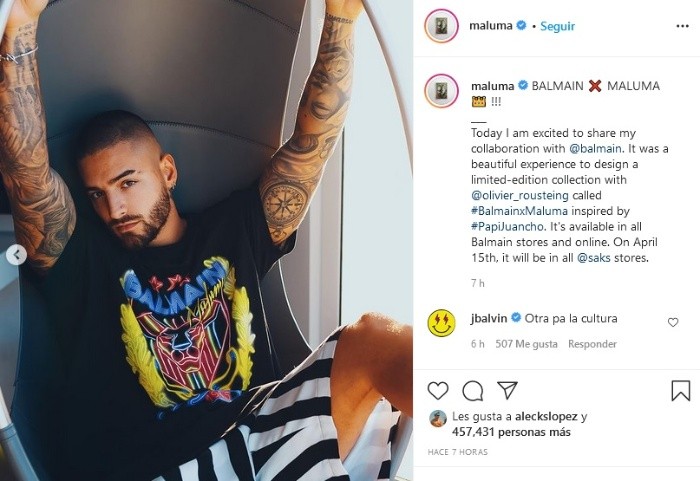 El cantautor colombiano Maluma se convirtió este lunes en el primer artista latino, y el segundo en el mundo, en anunciar que diseñó una línea de ropa de edición limitada en colaboración con la casa de alta costura parisina Balmain.Con "Maluma X Balmain", el artista, de 27 años, sigue así a la estrella estadounidense Beyoncé, quien en 2018 lanzó su colección con la exclusiva casa parisina e inspirada en los diseños de sus presentaciones en el icónico festival de Coachella.En el caso de Maluma, su colección está inspirada en el Miami de la década de los 90 y fusiona la estética del colombiano con la del director creativo de Balmain, el diseñador francés Olivier Rousteing, informaron este lunes el músico y la casa de modas.La colección, de 10 piezas, ya está disponible en la página web de Balmain y también podrá ser adquirida a partir del jueves en las tiendas de la casa de moda y en sus espacios en los almacenes de lujo Saks Fifth Avenue hasta finales de junio próximo.Los precios de la colección oscilan entre los 495 dólares que cuesta una camiseta hasta los dos mil 550 dólares, que es el valor de una chaqueta deportiva del estilo "bomber".Además, "Maluma X Balmain" incluye unos zapatos de goma negros con dorado por mil 150 dólares, un conjunto de bermuda y camisa por 950 dólares y mil 095, respectivamente, por pieza, y un "blazer" negro de rayas blancas por dos mil 295 dólares.El anuncio consolida la relación que se ha venido forjando entre las marcas de lujo y deportivas y los artistas del género urbano en español, que comenzó con el patrocinio de conciertos y siguió con patrocinio de ropa y zapatos.Tanto J Balvin como Bad Bunny han sacado sus propios modelos de calzado deportivo en los últimos meses.El primero sacó sus tenis "herencia", dentro del modelo Air Jordan de Nike, y el artista puertorriqueño primero colaboró con Crocs y hace dos semanas lanzó un modelo con Adidas.Además de esta iniciativa con Balmain, Maluma también anunció una gira internacional, que comenzará en Sacramento en septiembre, y este jueves se presentará en los Latin American Music Awards, para los que tiene cuatro nominaciones.jb