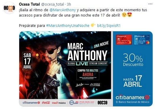 El cantante Marc Anthony se alista para su primer concierto en formato virtual, informó Ocesa al revelar que el próximo sábado 17 de abril, el reconocido ícono de la salsa ofrecerá un espectáculo único en su tipo a través del show inédito “Una Noche”.Ocesa compartió que este primer convierto streaming de Marc Anthony será transmitido en vivo desde Miami: “Se trata del primer y único concierto livestream del astro neoyorquino que llevará por nombre ‘Una Noche”, explicó en su comunicado sobre el show que a partir de hoy activará la venta de sus boletos en eticket.mx.“La vida nos ha cambiado… indudablemente. Pero la música sigue siendo un cable a tierra para todos. Nos permite seguir manteniendo viva la ilusión, el amor y la alegría. Y aunque por seguridad no podamos estar todavía frente a frente, estoy seguro de que este concierto creará una magia increíble, que logre conectarme con mi público, donde quiera que esté y con todos los que necesiten un toque de música para seguir adelante; para mantener la ilusión por la vida”, señaló Marc Anthony.A través de sus redes sociales como Facebook –con más de 18 millones de seguidores- Marc Anthony ha compartido detalles sobre la realización de este espectáculo con breves videos, además de invitar al público a seguir las nominaciones y votaciones de los Latin American Music Awards, en donde está como favorito en la terna de Artista Tropical.Ocesa confirmó que esta producción contará con la dirección del reconocido director creativo, ganador del GRAMMY y fundador de Elastic People: Carlos Perez (Despacito, Vivir Mi Vida, Esta Rico Apple Music Latin Playlist Branding, Spotify’s WY Live from The Hit Factory), además de tener la producción de Magnus Studios. La promoción y distribución del evento, a nivel mundial, estará a cargo de Loud And Live y Loud And Live Studios respectivamente, una de las empresas con mayor experiencia en eventos con audiencias globales.A la fecha Marc Anthony es el artista con más de 70 hits número 1 en la lista de Billboard (Latino), siete veces ganador del GRAMMY y Latin GRAMMY, y cuenta con más de 30 millones de álbumes vendidos en todo el mundo.De descendencia puertorriqueña, nació en Nueva York en 1968. Desde muy joven se dedicó a la música, hasta que en 1993 logró popularidad en el mundo de la salsa gracias a su versión del tema de Juan Gabriel Hasta que te conocí. Desde entonces, ha lanzado 13 álbumes de estudio que lo convierten en el artista de salsa más popular a nivel mundial.El cantante ha realizado colaboraciones con La India, Jennifer Lopez, Ricardo Arjona, Gente de Zona, Alejandro Sanz, Maluma, entre otros artistas internacionales. También ha participado en películas y ha sido compositor y cantante en diferentes agrupaciones. Actualmente está considerado como uno de los artistas más influyentes de su tiempo y un verdadero embajador de la música y la cultura latina.jb