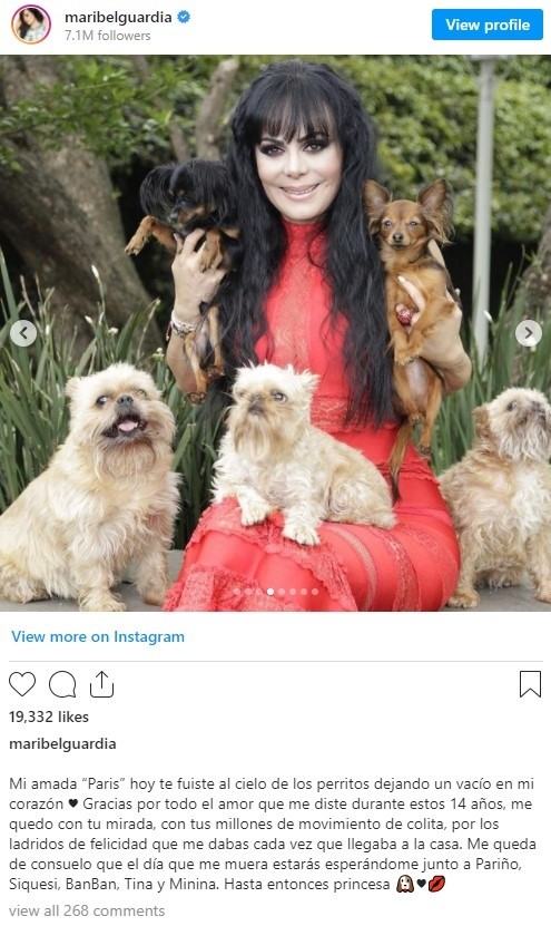 Maribel Guardia se encuentra en un triste momento de la vida, su perrita llamada Paris falleció, y a través de sus redes sociales, la actriz de 62 años la recordó con divertidas imágenes, en una de ellas aparece en el gimnasio, acompañando a la actriz para hacer ejercicio."Mi amada Paris hoy te fuiste al cielo de los perritos dejando un vacío en mi corazón. Gracias por todo el amor que me diste durante estos 14 años, me quedo con tu mirada, con tus millones de movimiento de colita, por los ladridos de felicidad que me dabas cada vez que llegaba a la casa. Me queda de consuelo que el día que me muera estarás esperándome junto a Pariño, Siquesi, BanBan, Tina y Minina. Hasta entonces princesa", se lee.Los fans de la también actriz le enviaron mensajes de consuelo; Maribel Guardia también le dio la bienvenida a la época navideña, pues ya puso su árbol y muy a su estilo posó junto a él con un atuendo de la época.AF