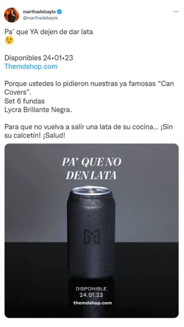 La conductora Martha Debayle sigue dando de qué hablar, pues en esta ocasión lanzó su propia marca de "calcetines" para latas, ante las críticas que ha recibido en redes sociales, luego de dar tips para atender a las visitas.Por medio de Twitter, la locutora compartió una imagen del producto para latas, que consideró "ya famosas" y para “que ya dejen de dar lata"."Porque ustedes lo pidieron nuestras ya famosas “Can Covers”. Set 6 fundas Lycra Brillante Negra. Para que no vuelva a salir una lata de su cocina… ¡Sin su calcetín! ¡Salud!", se lee en el tuit de la conductora.Aunado a ello, se reveló que la fecha de lanzamiento será este martes 24 de enero, mediante el sitio themdshop.com.Ante este hecho, usuarios de la red social criticaron a la presentadora.vll