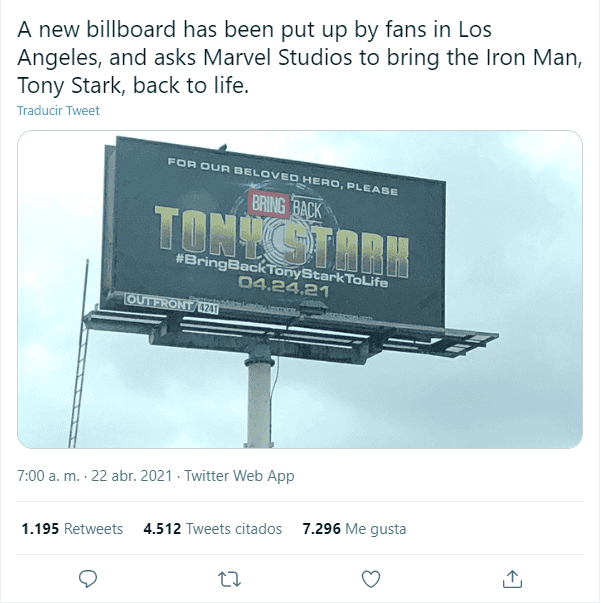 La ausencia de “Iron Man” en el Universo Cinematográfico de Marvel post “Endgame” sigue doliendo a algunos seguidores, que este jueves encontraron la manera de llamar la atención para que alguien tome el asunto en sus manos y hacer que Tony Stark regrese, aún después de haberse sacrificado por el bien de la humanidad en lo que muchos consideran un fin perfecto para su misión.Con la leyenda “Por nuestro querido héroe, por favor trae de regreso a Tony Stark”, un anuncio espectacular ha llamado la atención de miles de personas en Los Ángeles, California (Estados Unidos) y otros tantos en el mundo del Internet, quienes reaccionan a dicha iniciativa con la esperanza de que las redes sociales hagan lo suyo, tal como ocurrió con “La Liga de la Justicia” y la publicación de la versión del director Zack Snyder tras la exigencia de fanáticos.El hashtag #BringBackTonyStarkToLife (Trae de regreso a la vida a Tony Stark) acompaña el mensaje en dicho espectacular y una fecha es anunciada en él, siendo el 24 de abril de 2021 algo que ya despierta la ansiedad de los curiosos fans y no tan fans de “Iron Man”.Las reacciones en redes tampoco se han hecho esperar, algunas aplaudiendo la iniciativa, otras tanto cuestionando la petición, pues la muerte de Stark en “Avengers: Endgame” significó un final bastante digno para el personaje y su regreso a la vida podría implicar un “abaratamiento” de su historia, a decir de algunos internautas. Otros critican que los fans de Iron Man hayan copiado el movimiento de los seguidores de DC Comics para traer una nueva versión de “La Liga de la Justicia”.Este anuncio también alimentaría la esperanza que hace algunos meses Robert Downey Jr. despertó en los fans al decir “nunca digas nunca” con relación a un posible regreso del personaje que interpretó en más de una docena de películas del Universo Cinematográfico de Marvel.