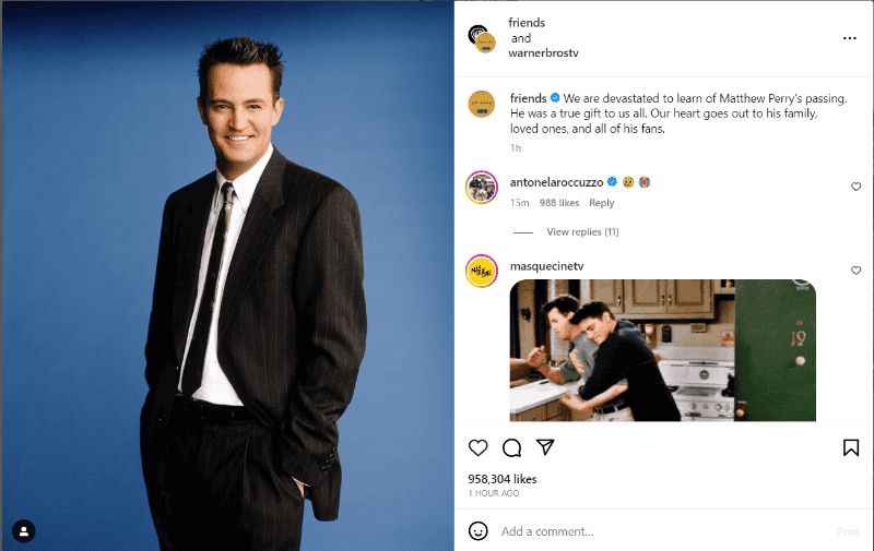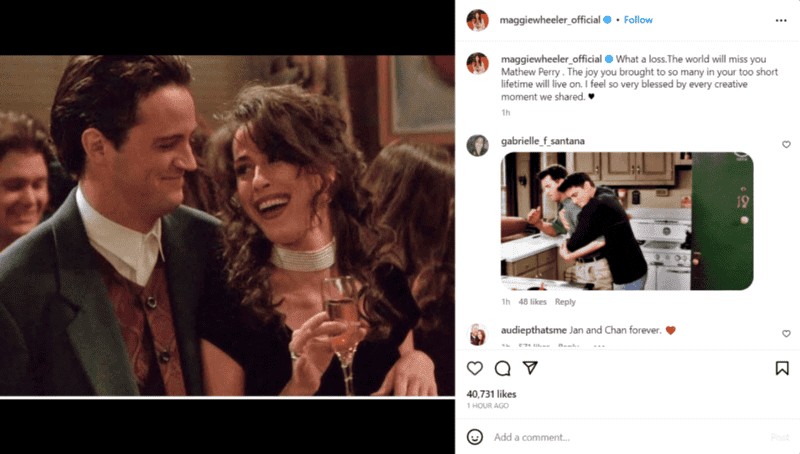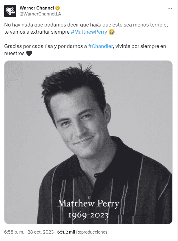 Horas después de haberse anunciado el fallecimiento del actor Matthew Perry, la tarde de este sábado 28 de octubre de 2023, celebridades estadounidenses han reaccionado a la triste noticia.Recordemos que el actor, hasta la fecha, es recordado por su participación en la famosa serie "Friends", donde dio vida al icónico Chandler Bing.A través de su cuenta de X (antes Twitter) Warner Channel LA le dedicó unas palabras al entrañable Matthew Perry:"No hay nada que podamos decir que haga que esto sea menos terrible, te vamos a extrañar siempre #MatthewPerry Gracias por cada risa y por darnos a #Chandler, vivirás por siempre en nuestros". Se lee en el texto que es acompañado por una fotografía de él en blanco y negro con la fecha de su nacimiento y muerte.Además, agregaron que sus corazones están destrozados por su partida y una vez más le agradecieron las risas y la amistad "Nada será lo mismo sin nuestro #Chandler #MatthewPerry", escribieron en otra publicación.Por su parte, mediante Instagram, la cuenta oficial de la serie también lamentó la pérdida del actor y le dedicaron unas palabras:“Estamos desolados por la noticia del fallecimiento de Matthew Perry. Él fue un verdadero regalo para nosotros. Nuestro corazón y condolencias para su familia, personas queridas y para todos sus fans”.Maggie Wheeler, quien también fue compañera de Perry en la serie Friends, fue de las primeras en reaccionar ante la muerte del actor.“Vaya pérdida. El mundo te va a extrañar Matthew Perry. La alegría que nos diste a lo largo de tu vida perdurará para siempre. Me siento bendecida por haber compartido momentos creativos”, señaló la actriz en su cuenta de Instagram.Meredith Salenger, una de las primeras amigas de Perry, a quien conoció a los 16 años, aseguró que su "corazón está roto" tras enterarse de la muerte de su amigo, sin decir más, le deseó descansar en paz.También se pronunció mediante X Mira Sorvino, dedicándole las siguientes palabras:"Encuentra paz y felicidad en el cielo, haciendo reír a todos con tu singular alegría”.Hasta el momento, son estas actrices y un sinnúmero de fans quienes han lamentado que el actor haya fallecido. YC