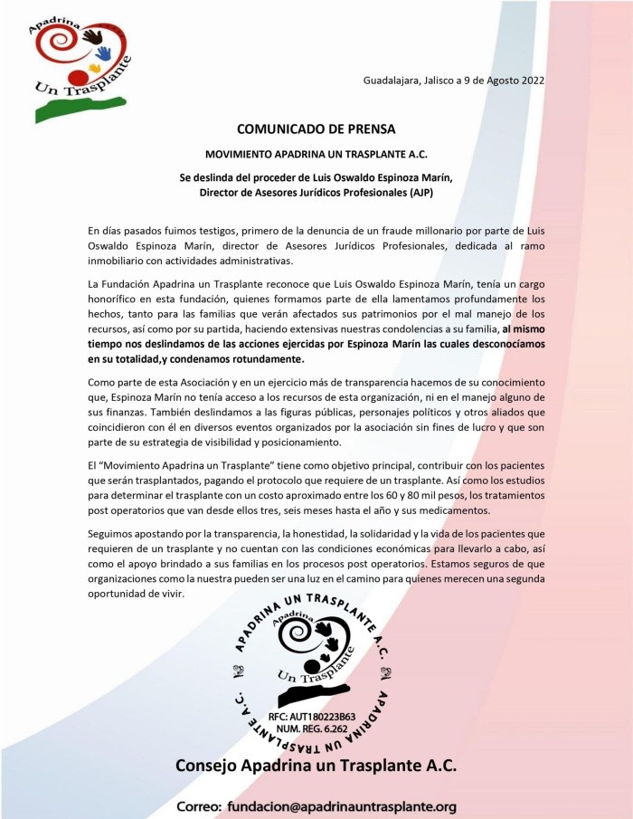Luego de que esta semana fuera señalado entre una de las posibles víctimas de la estafa millonaria llevada a cabo por la inmobiliaria Asesores Jurídicos Profesionales (AJP), el actor mexicano Mauricio Ochmann se deslindó de cualquier relación con Luis Oswaldo Espinoza Marín, dueño de la empresa, y quien se quitó la vida hace unos días tras admitir su delito.Mauricio Ochmann compartió un par de videos que subió a sus historias de Instagram, en los que el protagonista de Y cómo es él (2022) aseguró que ni él ni la fundación "Apadrina un trasplante", que creó hace ya varios años, están relacionados con esta situación y aprovechó para aclarar que su proyecto sólo tiene que ver con el amor.Al respecto mencionó que "hace 19 años, Elizabeth Castro, Mauricio Islas, 'El Piojo' Herrera y yo decidimos hacer activismo y así es como nace este proyecto de amor que es "Apadrina un Trasplante". Con el tiempo se fueron sumando más personalidades para ayudar a más personas que lo necesitan; así que nos deslindamos de cualquier situación en la que nos hayan querido involucrar".Asimismo, el actor agregó que la fundación también emitió un comunicado en el que lamentan la muerte de Espinoza Marín, y aclararon la relación que tenía con ellos. "En días pasados fuimos testigos de la denuncia de un fraude millonario por parte de Luis Oswaldo Espinoza Marín, director de Asesores Jurídicos Profesionales. La Fundación reconoce que Luis Oswaldo Espinoza Marín tenía un cargo honorífico en esta fundación, quienes formamos parte de ella lamentamos profundamente los hechos, tanto para las familias que verán afectados sus patrimonios por mal manejo de recurso, así como por su partida. Al mismo tiempo nos deslindamos de las acciones ejercidas por Espinoza Marín las cuales desconocíamos en su totalidad y condenamos rotundamente", expresó.Por otro lado, también señalaron Oswaldo Marín no tenía acceso a los recursos económicos de la organización y que tampoco manejaba sus finanzas, por lo que, así como el resto de sus fundadores y todas las personalidades del ambiente artístico que colaboran con ellos en el proyecto, no quieren ser vinculados con ninguna de sus actividades ilícitas y aseguran que fueron usados como "parte de su estrategia de visibilidad y posicionamiento".Cabe mencionar que así como Ochmann, el actor Mauricio Islas, también Cofundador de la organización, compartió un mensaje muy parecido al de su compañero, esto para deslindarse de cualquier problema.De la misma manera, la Asociación Civil compartió una carta en la que se deslinda por completo del fraude de Luis Oswaldo y la empresa de Asesores Jurídicos Profesionales (AJP):Es menester recordar que fue el pasado 5 de agosto cuando la noticia sobre el fraude de la inmobiliaria comenzó a cobrar importancia en redes sociales y medios, cuando varios de los afectados denunciaron a Oswaldo Espinoza Marín ante la Fiscalía del Estado (FGE) de Jalisco.Sólo dos días después de que las denuncias fueran interpuestas, el empresario no sólo admitió ser el único responsable del crimen en un video que publicó en su perfil social, sino que también se quitó la vida en su casa de Guadalajara.