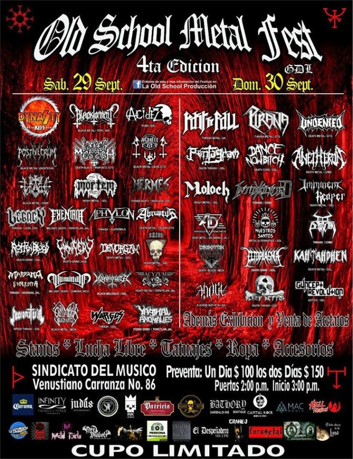 Durante los últimos años, Guadalajara ha tenido el privilegio de contar con los conciertos de las mejores agrupaciones de metal de todos los tiempos, desde Judas Priest, Metallica, Megadeath, Kreator hasta nuevas promesas como Ghost, pero ¿y el talento local?, ¿hay apoyo y escaparates para éste? El último fin de semana de septiembre, la Perla Tapatía se llenará de sonidos pesados de la vieja guardia con más de 40 agrupaciones de metal nacional, un par de propuestas internacionales, exposición fotográfica, área de tatuajes, viniles, lucha libre femenil y más novedades dentro del marco de la cuarta edición del Old School Metal Fest, que se llevará a cabo el sábado 29 y domingo 30 de septiembre en el Sindicato del Músico (Venustiano Carranza #86).“No es negocio hacer eventos de metal en esta ciudad, lo hacemos por el mero amor al arte, y lo hacemos felizmente”, confiesa Manuel Reveles, quien junto con María Luisa, su esposa, han llevado a buen puerto este festival que ha surcado el estigma, y poco a poco se va convirtiendo en una tradición.“En la primera edición tuvimos que lidiar con muchos factores: los permisos, las carencias en todos sentidos, la falta de apoyo, egos de las mismas bandas... En esa ocasión fueron sólo 18 agrupaciones y un sólo día, ahora tenemos el doble repartidas en todo el fin de semana y un montón de actividades más que podrán ser disfrutadas por más de 20 horas”.Conoce el talento de esta ediciónLa exhibición de Lucha Libre femenil, correrá a cargo de Morrígan, Mariposa Rosa, Gladís Nigth, Gladiola Negra, Denebola, Valkíria, Aliss Mar y La Mestiza Brillante.Los boletos tienen un costo por día de $100, o los dos por $150. Las puertas serán abiertas a partir de las 14:00 horas y hasta pasada la media noche.Expositor de casaAsí mismo, durante el evento se llevará a cabo la muestra fotográfica de Alfredo García Andrade, fotógrafo nacional egresado de la Licenciatura de Artes Visuales de la UdeG con casi 20 años de experiencia, en los cuales ha retratado a personajes tan importantes como el Papa Benedicto, Papa Francisco, Vicente Fox, Felipe Calderón, Enrique Peña Nieto, los últimos cinco gobernadores del Estado, escritores como Gabriel García Márquez, Fernando del Paso, José Saramago.También ha tenido el placer de combinar sus dos grandes pasiones: la foto y la música pesada, capturando a los mejores exponentes del género: Metallica, Slayer, Kiss, Mötley Crüe Korn, Iron Maiden, Rob Zombie, Dark Funeral, Anthrax, Black Sabbath con Dio, Slash, Épica, Brujería… mismos que formarán parte de su libro “Photo & Metal”, que estará disponible en 2019, y que en el marco de este festival se exhibirán 29 de sus fotografías con la posibilidad de ser adquiridas por quienes las deseen. Las instantáneas serán de 20x24 pulgadas impresas en papel metálico, montadas en foam board rígido, totalmente enmarcadas para disfrutar.“La música es algo que se va sintiendo al momento. El músico, con su instrumento, saca todo lo que quiere comunicar y como fotógrafo lo que tenemos que hacer es inmortalizar ese momento para la posteridad, captar todas esas emociones en el lente”, comparte quien inició en el mundo del freelance, en eventos para sociales y que ahora se desempeña como editor y jefe de fotografía de EL INFORMADOR.Era el 1 de marzo de 2010 cuando Metallica visitaba por primera vez Guadalajara. El Estadio 3 de Marzo lucía repleto. No cabía un alma más. El setlist comenzaba y con ello los escasos minutos para que los fotógrafos realizaran su labor de reportar gráficamente el concierto. “Creeping Death” abría y proseguía con “For Whom the Bell Tolls”. Era todo. Se terminó el tiempo para los fotógrafos y el equipo de seguridad los retiraba del ‘pit’ -espacio destinado para los fotógrafos-. Pero Alfredo no se quería ir sin “La Foto”: “Yo siempre busco la foto que nadie más retrate, esa que sea única”.Uno de los guardias retiraba a empellones a García Andrade y éste ni tardo ni perezoso se esforzaba “para tirar” unas instantáneas más por encima de su hombro ante el enojo del corpulento guardia norteamericano. La acción la vio desde el escenario James Hetfield, líder de la agrupación, quien esbozó una sonrisa. El momento quedó capturado.En otra ocasión se metió hasta los improvisados camerinos del Sindicato de los Comerciantes durante la presentación de la banda de punk, Misfits. “Entré al camerino, llegué ‘disparando’ a sabiendas que tenía sólo segundos antes de que me sacaran. Lo encontré sentado, de costado a la entrada, con una sonrisa pero a la vez asombrado, sin la pose ruda con la que se caracteriza, era el bajista y vocalista Jerry Only, es una foto en la que se ve más al humano que al músico y ese precisamente es el hilo conductor del libro ‘Photo & Metal’, captar al ser humano por sobre el artista que vemos en escena”.Para quienes desean disfrutar parte de su trabajo y adquirir sus obras, pueden verlo en sus redes sociales: Facebook/Photo&Metal y Instagram/alfredohell.