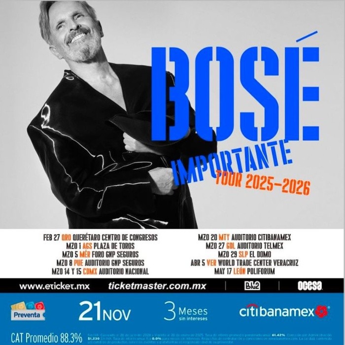 Después de una ausencia de más de ocho años, Miguel Bosé vuelve a los escenarios mexicanos con su gira "Importante Tour". Como parte de este recorrido, el icónico cantante español se presentará el próximo 27 de marzo de 2025 en el Auditorio Telmex.Miguel Bosé, una de las figuras más influyentes de la música en español, inició su trayectoria musical en 1977 con su álbum 'Linda'. Desde entonces, ha cautivado al público con su voz inconfundible, carisma y versatilidad artística. Su música, que transita entre baladas románticas y ritmos experimentales lo han consolidándose como un referente de la música pop. Durante más de 40 años de carrera, Bosé no solo ha acumulado una amplia base de seguidores, sino también numerosos reconocimientos, como el World Music Award al Artista Español con más ventas a nivel mundial en 2007 y un Grammy Latino al Mejor Álbum de Pop Vocal Masculino por Sereno en 2002. Además, ha colaborado con artistas destacados como Rauw Alejandro, Ximena Sariñana, Los Ángeles Azules y Pepe Aguilar, expandiendo su impacto musical a nuevas generaciones.El 'Importante Tour' recorrerá diversas ciudades mexicanas, llevando su legado musical a diferentes rincones del país:Los boletos para el concierto en Guadalajara estarán disponibles en Preventa Citibanamex a partir del jueves 21 de noviembre. La venta general comenzará el 22 de noviembre en las taquillas del Auditorio Telmex y a través de Ticketmaster.SV