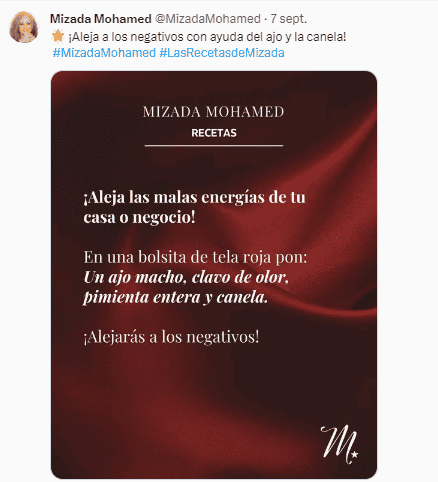 Empezar a sentir las malas energías estancadas en el hogar, oficina o negocio no permiten que la energía vital siga su camino, por lo que empieza a afectarnos internamente, bloqueando también nuestra energía. Para que esto no suceda es crucial hacer limpieza profunda, más allá de limpiar el espacio físicamente, también hay que hacer una limpieza energética.Hacer un movimiento energético es importantísimo cuando constantemente aparecen emociones negativas, situaciones desafortunadas o hay abundancia bloqueada.Para saber si hay energía negativa en casa lo primero que hay que hacer es fijarse en los síntomas de ésta, por ejemplo si hay enfermedades con frecuencia, situaciones de violencia, víctimas de robo, atracos, mascotas inquietas, desorden generalizado, tristeza y soledad, son sólo algunos de los muchos rasgos de que hay energía estancada o incluso un mal de ojo.Mizada Mohamed en #LasRecetasdeMizada explica cómo puedes alejar los negativos con tres sencillos ingredientes que tienes en tu alacena.En una bolsita de tela roja deberás poner un ajo macho, clavo de olor, pimienta entera y canela. Una vez que lo tengas mantenerlo por un tiempo en casa, el negocio o el lugar donde quieres que se limpie y ¡listo! poco a poco empezarás a sentir la magia de este poderoso remedio.