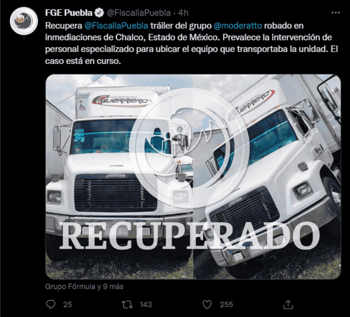Luego de que se diera a conocer en redes sociales que la banda de Moderatto sufrió el robo de su equipo en una carretera de México, la fiscalía abrió una carpeta de investigación sobre el caso, motivo por el cual se contactó al representante de la agrupación por parte del Fiscal Regional de Amecameca, siendo el mismo quien informó que el camión fue localizado en Puebla.En trabajo en conjunto con la Fiscalía General de Justicia de Puebla, la Fiscalía General de Justicia del Estado de México seguirá trabajando para el esclarecimiento de este caso.Ya que en la madrugada de este viernes, la agrupación de Moderatto dio a conocer que un comando robó el camión con su equipo y secuestró por unas horas a sus choferes en la caseta de la autopista México-Puebla, resaltando que el robo ocurrió en una de las casetas de Chalco, mientras se dirigía a Puebla, donde tenían programada una presentación.El mánager de la banda detalló que ocurrió alrededor de la 01:00 de la mañana y aunque el camión fue encontrado horas más tarde, este ya había sido saqueado, por lo que el equipo sigue estando desaparecido.Hasta ahora trascendió que un comando se subió al camión, golpearon las ventanas con pistolas y bajaron a los tres choferes, los encapucharon y se los llevaron en un auto. "Los camiones tienen GPS, se ve que el camión lo movieron y luego estuvo parado como una hora, hora y media, en un lugar, donde sospechamos que pasaron todas las cosas. El camión aparece ahorita en un corralón en Puebla, pero al parecer está vacío, es la poca información que tenemos hasta ahorita", comentó el mánager.La agrupación lo único que pide es apoyo para recuperar su equipo, pues se dirigían para la Feria de Puebla, donde se presentarían esta noche.MV