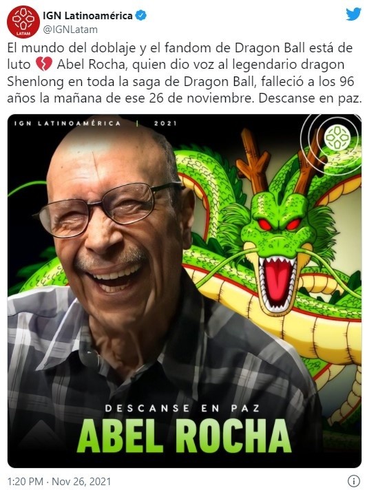 Falleció el actor Abel Rocha, quien prestó su voz a los personajes Shen Long, Emma Daioh Sama y Nail de “Dragon Ball”, también participó en animes como "Naruto", "Digimon: Digital Monsters", "Ranma 1/2" y la caricatura "Hora de aventura".La noticia la dio a conocer Lalo Garza, actor de doblaje que interpreta a Krillyn en "Dragon Ball Z", y fue confirmada por la Asociación Nacional de Intérpretes."Se nos adelantó mi querido Abelito, la única e inigualable voz de Shenlong en DBZ. Ya descansas en paz, amigo. Gracias por tu gentileza, tus palabras lindas siempre, tu bondad, tu sonrisa, te extrañaré", declaró Garza en su cuenta de Twitter.Para su canal de YouTube, Lalo Garza entrevistó en 2018 a Rocha, quien fue "una pieza muy importante en la historia de 'Dragon Ball'", declaró Garza en aquel entonces.En aquella entrevista, Rocha explicó que llevaba más de 20 años dando voz a Shen Long.El actor inició su carrera luego de decirle a su hermana Gloria que probara sus habilidades en el área de doblaje. Y es que Gloria es nada más y nada menos que la "madrina del doblaje" en el campo.Rocha también reveló que tuvo una faceta como cantante en un restaurante y que cantar era una de sus más grandes pasiones."No dejo de trabajar nunca, de disfrutar cada grabación, cada encuentro, de reír, de gozar la vida. Un ejemplo de amor por vivir", escribió en Facebook el actor de doblaje Javier Rivero sobre cómo era Abel Rocha.AF