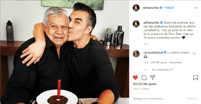 La noche de este lunes, Adrián Uribe reportó la muerte de su padre al despedirlo con un emotivo mensaje a través de redes sociales.El actor acompañó su publicación con una fotografía en su cuenta de Instagram donde dio a conocer la noticia. En ella, Uribe, de 48 años, aparece besando a su padre durante su último cumpleaños. “Quién iba a pensar que ese día estábamos festejando tu último cumpleaños. Hoy estás en el cielo en la presencia de Dios. Buen viaje pa. Te vamos a extrañar”, escribió Adrián.Hasta el momento se desconoce la causa de la muerte del padre de Adrián Uribe, sin embargo, ha recibido muestras de apoyo por parte de sus compañeros, como Consuelo Duval, Yuri, Paul Stanley, Ninel Conde y Latin Lover, entre otros.Recientemente Adrian Uribe y Thuany Martins se convirtieron en papás de una una niña con el nombre Emily.AC
