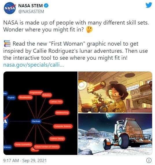 Este viernes, la NASA anunció el lanzamiento en español de "First Woman" (La primera mujer), una historieta digital e interactiva que presenta la historia de "Callie Rodriguez", la primera mujer en pisar la Luna, según la historia producida por la agencia espacial estadounidense.La trama de "Primera mujer: la promesa de la NASA para la humanidad" es protagonizada por Rodríguez, "una afrolatina motivada que supera múltiples desafíos en su vida para convertirse en la primera mujer en explorar la Luna", comentó la agencia espacial en un comunicado.Con esta novela gráfica de ficción, ya disponible para leer en la lengua de Cervantes, "la NASA tiene como objetivo inspirar a la próxima generación de exploradores: la Generación Artemis", detalla."Si bien la historia de Callie es ficticia, la primera mujer y la primera persona de color caminarán sobre la Luna, logrando estos hitos históricos como parte de las misiones Artemis", añade el comunicado."Callie, al igual que yo, desarrolló sus habilidades, aprovechó oportunidades para aprender y superó desafíos para convertirse en astronauta de la NASA. (...) es importante que podamos vernos a nosotros mismos como los exploradores entre las estrellas", agregó Melroy.La historieta cuenta que Callie, diminutivo de Calista, soñaba de niña con viajar al espacio y su sueño empieza a hacerse realidad cuando es seleccionada como candidata a astronauta.A partir de ahí su objetivo es ser la primera mujer que pise el satélite de la Tierra, algo que consigue en un viaje junto a Dan, un astronauta del programa Artemis como ella misma.El cómic, de 40 páginas, destaca las tecnologías de la agencia espacial para viajar a la Luna, alunizar y explorarla."Traducirlo al español fue el siguiente paso natural para la NASA, ya que el compromiso de la agencia con la diversidad, la equidad y la inclusión conlleva expandir sus comunicaciones en español para llegar mejor a la población hispana en los Estados Unidos y más allá", explica el comunicado."Al destacar a una afrolatina y gracias a la traducción de la novela gráfica al español, podemos expandir nuestro alcance a la comunidad hispana, la segunda comunidad étnica más grande y también la segunda de más rápido crecimiento en el país", apuntó por su parte Rashahra Lambert, asesora sénior en la NASA."La pasión y la perseverancia" llevan a Callie a hacer que sus sueños se cumplan, "pero no sin enfrentar desafíos en el camino", señaló la NASA en la presentación de "First Woman", cuyo primer capítulo fue publicado el pasado 25 de septiembre, Día Nacional del Cómic en EE.UU.Según la agencia espacial estadounidense, varias mujeres de carne y hueso han inspirado este cómic digital e interactivo empezando por la rusa Valentina Tereshkova, primera mujer en viajar al espacio.Sally Ride, primera mujer estadounidense en viajar al espacio, y Mae C. Jemison y Ellen Ochoa, primera afroamericana y latina en lograr ese objetivo, respectivamente, también están entre ellas.AF