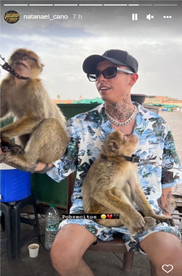 El cantante de los corridos tumbados Natanael Cano se encuentra de visita en Marruecos y ha compartido con sus seguidores algunas de las experiencias que está viviendo en el país, sin embargo, una de sus fotografías llamó la atención de los usuarios, pues se retrató con unos monos encadenados.Fue en Instagram donde Natanael compartió la foto y expuso la situación, asimismo, posteó que el animal se llama Marco.Pese a la crudeza de la imagen, sus seguidores no han hecho comentarios negativos al respecto, algunos hasta postearon que les gusta la imagen."Esta es la mejor foto que he visto", escribió la usuaria carlyelvington75.Mientras que otros de sus fanáticos le pidieron salvara a los monos. "Cómpralo y déjalo libre", opinó bourjac.21De acuerdo con medios de circulación nacional, el cantante expresó a través de comentarios que no apoyaba el maltrato, sin embargo, respeta las culturas de cada país: "y este me encanta, para qué hablar, mal pónganse pa' lo suyo niños que aun así no estemos a favor esos monitos seguirán ahí, mínimo hoy comerá rico".En sus historias se pueden ver otras fotos con la especie donde escribió: "Pobrecitos" junto a un corazón roto y un emoji, demostrando que no está de acuerdo con dichas prácticas y agregó que le llevarían alimento a los changos.MF