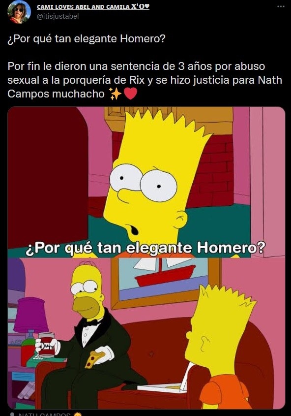 Este miércoles trascendió que el youtuber “Rix” —de nombre Ricardo “N”— fue sentenciado a tres años y dos meses por el delito de violación equiparada en grado de tentativa en contra de la influencer Nath Campos. Esto alegró a la propia youtuber, quien compartió su sentir sobre el caso que se volvió viral hace unos meses.Además, los internautas no dudaron en reaccionar al respecto, mostrando el apoyo hacia Nath Campos y condenando las acciones de “Rix”.“Memo Aponte viendo que le dieron 3 años de cárcel a Rix por abuso a Nath Campos”, escribió @ChicoFlash_. Otro más dijo que el día era para estar “elegante” debido a la noticia que hizo justicia al caso de Nath.“Hoy no sólo ganó Nath Campos, hoy ganamos todas, gracias por ser una fuente de inspiración para las mujeres”, dijo @zoezetina. "Rix", de 29 años, fue denunciado públicamente por Nath Campos por abuso sexual, mediante un video en su canal de YouTube, en el cual explicó que ya había procedido legalmente para hacer justicia penal por el abuso que sufrió en 2017.El 26 de frebrero se vinculó a proceso encontra de Ricardo "N" y se estableció la prisión preventiva.Hace algunos días, Rix se declaró culpable y asumió su responsabilidad penal y se le dictó sentencia de tres años y dos meses.***Si te interesó esta noticia y quieres saber más, entonces descarga y descubre INFORMAPlus, la aplicación digital de EL INFORMADOR, en donde tenemos contenidos exclusivos, seleccionados por nuestros editores, para darles una experiencia más completa a los lectores.Descarga la aplicación y pruébala GRATIS por treinta días.Para iOS: https://apple.co/35jaVgbPara Android: https://bit.ly/3gwVSEVSi eres suscriptor de EL INFORMADOR tu acceso está incluido, solicítalo al 33 3678-7777AC