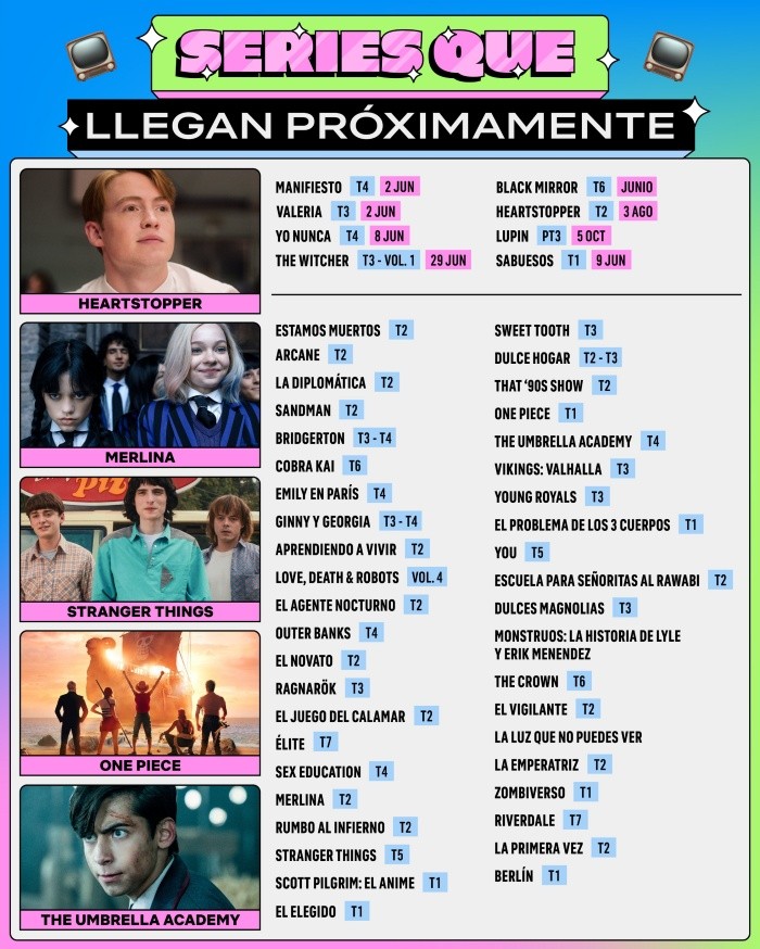 Se ha cumplido casi medio año de este 2023 y los usuarios de la plataforma de Netflix han podido disfrutar de una infinidad de estrenos que llegan todos los meses tanto como de películas, series y documentales. Netflix es una de las plataformas de streaming que más se ve en todo el mundo, incluido México, pues han llegado grandes series como “Stranger Things”, “Dark”, “Breaking Bad”, “Club de Cuervos”, “El juego del calamar”, “La Casa de Papel”, entre muchas más. También nos han sorprendido con películas nacionales e internacionales como es el caso de la película de Turquía, “Milagro en la celda 7” y “Pinocho” que fue dirigida por el tapatío Guillermo Del Toro y que incluso ganó el Oscar a mejor película animada.Aunque ya se fueron los primeros cinco meses del 2023, aún quedan varias películas y series por estrenarse en la plataforma. Netflix compartió una lista en sus redes sociales de las series que están próximo a estrenarse, algunas de ellas en este 2023 y otras en el 2024.Entre las series más esperadas se encuentra la quinta temporada de "Stranger Things", la segunda temporada de "Merlina" y la segunda parte de "El juego del calamar". A continuación te dejamos la lista completa:MF