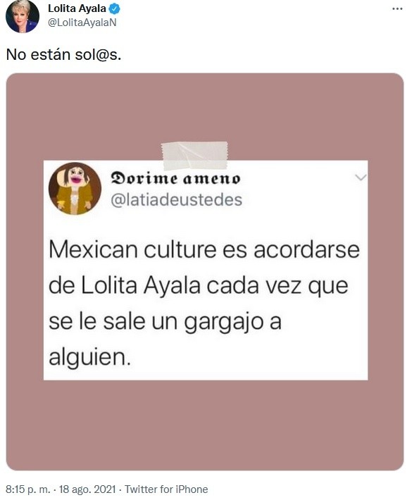 La periodista Lolita Ayala se ha convertido en una sensación en las redes sociales luego de algunos sucesos graciosos que atravesó durante su participación en el noticiero que conducía en Televisa y que finalizó en el año 2016, como aquel en el que tuvo problemas con una mucosidad en su garganta, conocida como gargajo, en plena transmisión en vivo.A partir de eso, Lolita Ayala se ha hecho aún más famosa en las redes sociales y ha sacado provecho con la venta de artículos que hacen alegoría de sus pifias. Así, un usuario de Twitter compartió un mensaje que decía: "Mexican culture es acordarse de Lolita Ayala cada vez que se le sale un gargajo a alguien", al que Lolita Ayala respondió: "No están sol@s" al tiempo que compartió la mención en su propia cuenta.Fue en una transmisión cuando a Lolita Ayala se le escapó "un gallo", como se les llama coloquialmente a las flemas en la garganta, cuando daba una nota en la que el nombre "Phill Barrera" se volvió un emblema del momento por ser justo la oración que pronunciaba cuando sucedió el penoso incidente.El mensaje al que Lolita Ayala le dio "retweet" tiene hasta el momento 75.4 mil "Me gusta" y más de 9 mil 500 reacciones.Si te interesó esta noticia y quieres saber más, entonces descarga y descubre INFORMAPlus, la aplicación digital de EL INFORMADOR, en donde tenemos contenidos exclusivos, seleccionados por nuestros editores, para darles una experiencia más completa a los lectores.Descarga la aplicación y pruébala GRATIS por treinta días.Para iOS: https://apple.co/35jaVgb Para Android: https://bit.ly/3gwVSEVSi eres suscriptor de EL INFORMADOR tu acceso está incluido, solicítalo al 33 3678-7777OA