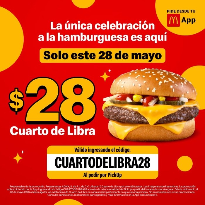 Este 28 de mayo se conmemora el Día de la Hamburguesa, y en México no faltan los motivos para unirse a la fiesta gastronómica, si bien Carl’s Jr. se ha ganado la atención con su ya tradicional hamburguesa Famous Star con queso que podrá adquirirse por solo un peso, (siempre y cuando se compre junto a cualquier combo del menú), también hay otros restaurantes que se unirán a esta celebración con promociones imperdibles. Este miércoles 28 de mayo prepárate para comerte una deliciosa hamburguesa de Cuarto de Libra de McDonalds por tan solo 28 pesos.Toma en cuenta que el precio solo es válido si pides tu hamburguesa por PickUp, a través de la aplicación de McDonalds ingresando el código CUARTODELIBRA28 a partir del horario de menú regular.Solo será válida el 28 de mayo y no es acumulable con otras promociones. El 28 de mayo podrás tener una hamburguesa Whopper completamente gratis, pero solo si compras un combo, de acuerdo con lo informado en sus redes sociales.Recuerda que con la tarjeta Círculo INFORMADOR puedes disfrutar de un 15% McTrío grande, válido en todos los McDonald's de Guadalajara de lunes a viernes, no aplica en Automac. Válido en McTríos seleccionados: Big Mac, McNuggets de 10 piezas, McNifica y Cuarto de Libra. Válido al presentar únicamente la tarjeta digital.NA