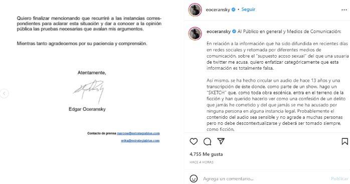 Después del audio que se volvió viral en redes sociales, donde se escucha decir al cantautor Edgar Oceransky que le gustan las niñas de 15, el cantante sale a responder sobre los señalamientos que es criticado."Sobre el 'supuesto acoso sexual' del que una usuaria de Twitter me acusa, quiero enfatizar categóricamente que esta información es totalmente falsa", escribió y explicó sus razones en redes sociales.En el audio y texto que circulan en la red el artista declara: "A mí me gusta la diversidad, pero mi preferencia más profunda son las adolescentes, ¿no? que tengan todavía cara de Ministerio Público, sí, miren, mejor ir 'al bote' por una chavita que por el alcoholímetro", se le escucha decir.Tras declaraciones, se ha desatado una oleada de cancelaciones de shows del artista, como en el Auditorio Nacional, recinto que informó que ya no se realizará su concierto programado para el 15 de marzo.Al respecto de este material, comentó que las declaraciones fueron sacadas de su contexto."Así mismo, se ha hecho circular un audio de hace 13 años y una transcripción de éste donde, como parte de un show, hago un 'SKETCH' que, como toda obra escénica, entra en el terreno de la ficción y han querido hacerlo ver como una confesión de un delito que jamás he cometido y del que jamás se me ha acusado por ninguna persona en alguna instancia legal. Probablemente el contenido del audio sea sensible y no agrade a muchas personas, pero no debe descontextualizarse y deberá ser tomado siempre, como ficción".Agregó que debido a estas declaraciones, casi todos los conciertos de su gira "Estoy Aquí 20 años" han sido cancelados lo que afecta la situación económica de muchas familias de manera injustificada."Aclaro estos puntos con el firme propósito de desactivar esta calumnia, la cual no solo ha afectado a mi persona sino a mi familia, a mis colaboradores y amigos, pero sobre todo a mi público que durante más de dos décadas ha estado conmigo".El cantautor finalizó su comunicado señalando que acudirá a las instancias correspondientes para esclarecer la situación."Quiero finalizar mencionando que recurriré a las instancias correspondientes para aclarar esta situación y dar a conocer a la opinión pública las pruebas necesarias que avalan mis argumentos".AF
