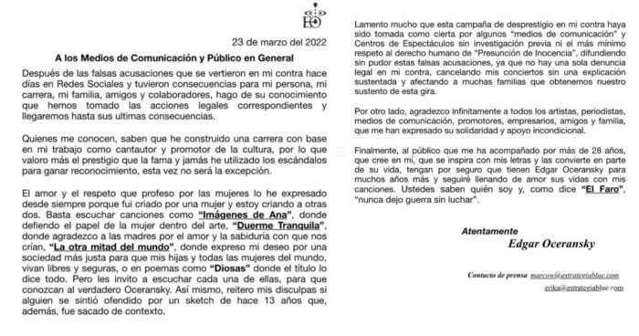 Tras rechazar los señalamientos de acoso, Édgar Oceransky decide emprender acciones legales por difamación. El músico fue acusado en redes sociales de acosar supuestamente a menores de edad."Después de las falsas acusaciones que se vertieron en mi contra en redes sociales en días pasados, y que tuvieron consecuencias sobre mi persona, mi carrera y mi familia, mis colaboradores, quiero decir que hemos tomado las acciones legales correspondientes y llegaremos a las últimas consecuencias", explicó en el video que publicó.A través de sus redes sociales, el cantante mexicano aseguró que su familia y seres cercanos se han visto perjudicados por las denuncias públicas en su contra, así como su trabajo también se ha visto afectado.Negó que en sus años de carrera haya tenido que recurrir a escándalos para obtener publicidad y que el video en el que se le ve diciendo que le gustan las menores de edad fue un sketch de hacer 13 años que se sacó de contexto."El amor y el respeto que profeso por las mujeres lo he expresado desde siempre porque fui criado por una mujer y estoy criando a otras dos", dijo.Afirmó que jamás le haría daño a ninguna mujer, ya que es un hombre que a lo largo de su vida ha estado rodeado de mujeres que no solo lo han inspirado sino que también lo han formado como artista y ser humano.Tras las declaraciones que se difundieron, el Auditorio Nacional y otras plazas cancelaron las presentaciones que se tenían con el músico, y el municipio de Querétaro retiró el apoyo para el Trovafest, que Oceransky realizaba desde 2014 para apoyar a la trova.AF