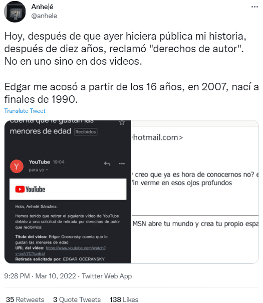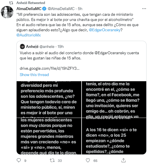La búsqueda de Edgar Oceransky ha crecido en redes sociales después de que se difundiera un audio en donde el cantautor mexicano asegura prefiere a las adolescentes por ser menos complicadas que las mujeres adultas. Las palabras del músico fueron puestas en redes por la usuaria Anhelé Sánchez en Twitter, quien colabora en vice.com.En su oficina comentaron que el audio, sacado de un show, data de hace más de diez años."No tengo miedo, me gusta la diversidad, pero mi preferencia más profunda son las adolescentes ¿no?.. Que tengan todavía cara de ministerio público, sí, miren, es mejor ir al bote por una chavita que por el alcoholímetro, sé lo que les digo", se oye al cantante de "Las cartas sobre la mesa" y "Un beso grande".Las palabras de Oceransky fueron grabadas durante un concierto y formaron parte, señala una fuente, de un "aproach" a una canción por interpretar, es decir, como una introducción para el público.En el mismo audio el cantante apunta que su siguiente canción fue dedicada a una exnovia, a quien conoció cuando ella tenía 15 años y él algunos más.Entonces comienza a platicar que tuvo un reencuentro con ella años después en Facebook y es cuando Oceransky habla de las diferencias entre mujeres adolescentes y adultas."No es lo mismo porque miren, con el tiempo las mujeres se van volviendo más ariscas cada vez, ¿no?.. Una chava la conoces a los 15 años y tú le propones lo que quieres y ella te dice 'sí' o te dice 'no', simple, las mujeres adolescentes son muy claras porque no están pervertidas"."Las mujeres grandes mientras más van creciendo 'no' es 'sí' y 'no', menos; depende qué día te lo digan, con qué cara te lo digan, en qué momento del ciclo se encuentren y en qué situación te lo digan, entonces es como muy complicado, ¿no?", considera.Y agrega: "Tú le preguntas a una muchacha '¿quieres conmigo'? y tú esperas una respuesta monosilábica. A los 16 te dicen sí o te dicen no, a los 25 empiezan ¿dónde estudiaste?, ¿cómo te apellidas?, ¿dónde trabajas?, ¿qué signo eres?, ¿ya leíste a Shopenhahuer' y dices 'para platicar tengo a mis amigos'. Se complica un poco la vida de las mujeres más grandes".De la oficina de Oceransky indicaron que no habrá postura pública."Lo que tengamos será a través de las instancias correspondientes, las medidas que tomemos serán por las vías adecuadas, no en los medios", subrayaron."Usted defiende el abuso de menores de edad", escribió Faesler dentro de un mensaje.En las redes sociales del cantante usuarios han dejado mensajes reprobatorios, entre ellos de la poeta Carla Faesler.La próxima semana Oceransky, de 46 años, tiene presentación programada en el Auditorio Nacional.AF