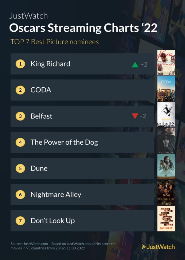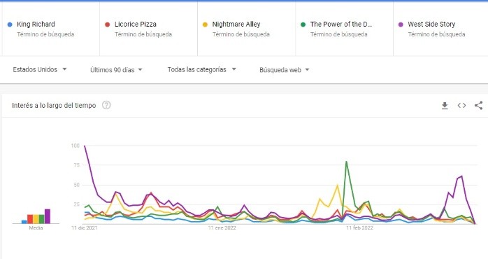 Poco a poco se acerca el gran día de la ceremonia de los Premios Oscar 2022 y la popularidad de algunas películas han incrementado considerablemente desde el anuncio de las nominaciones.Este interés por parte del público podría dar algunas pistas de cuál sería la película que se lleve el mayor premio a la Mejor Película. De acuerdo con datos de Just Watch, la película “King Richard” —protagonizada por Will Smith— lidera la popularidad en las transmisiones por streaming. En comparación con la semana pasada, “Belfast” disminuyó su popularidad hasta el tercer lugar; mientras que “CODA” —con Eugenio Derbez— se mantuvo en la segunda posición.El resto de la lista lo completan “El Poder del Perro”, “Dune”, “El Callejón de las Almas Perdidas” y “No miren arriba”.En INFORMADOR.MX consultamos los datos de Google Trends, herramienta de la compañía estadounidense que mide las búsquedas de sus usuarios en el buscador en tiempo real, hasta este día, son las películas “Don´t Look Up” y “the Power of the dog” las que se mantienen como la más populares en Estados Unidos. Incluso, la recién estrenada en Disney+ “West Side Story” podría sorprender.Para los mexicanos, se trata de “CODA” la que se ha colocado como la favorita entre los cinéfilos, por encima de “El Callejón de las Almas Perdidas” y “El Poder del Perro”.La ceremonia de los Premios Oscar se llevará a cabo el próximo domingo 27 de marzo.AC