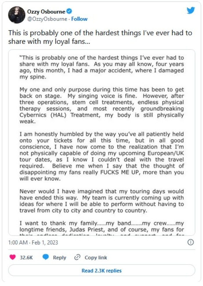 El cantante de heavy metal Ozzy Osbourne ha anunciado la cancelación de sus próximos espectáculos y ha asegurado que ha dado por finalizadas sus giras porque "ya no se siente físicamente capaz" de llevarlas a cabo."Esta es probablemente una de las decisiones más duras que he tenido que compartir con mis leales seguidores. Como sabéis, hace cuatro años, este mes, tuve un grave accidente en el que me lesioné la columna", dijo el cantante británico en un mensaje en Twitter.El artista, de 74 años nacido en Birmigham (Inglaterra) y residente en Los Ángeles (EEUU), agrega que, debido a ello, "ya no puede hacer frente a los viajes necesarios para una gira"."Mi único propósito durante este tiempo ha sido volver al escenario", dijo. "Mi voz para cantar está bien. Sin embargo, después de tres operaciones, tratamientos con células madre, fisioterapia interminable y, más recientemente, el innovador tratamiento Cybernics (HAL), mi cuerpo todavía está físicamente débil", precisó.Durante su carrea, que comenzó como miembro de la banda de heavy metal Black Sabbath, Osbourne ganó varios premios Grammy, tanto por su trabajo en solitario como por formar parte de ese grupo, que dejó en 1978, recuerda la cadena CNN."Nunca pude imaginar que mis días de giras podrían acabar de esta manera. Mi equipo está tratando de encontrar la forma de que pueda interpretar sin tener que viajar de ciudad en ciudad, de país en país", explicó el cantante de "Iron man" en su mensaje.El ganador de varios premios MTV agradeció también a su equipo, su familia, sus amigos de toda la vida, al grupo Judas Priest y, por supuesto, a sus seguidores por su lealtad, apoyo y por darle "una vida que jamás pensó que podría tener".JM