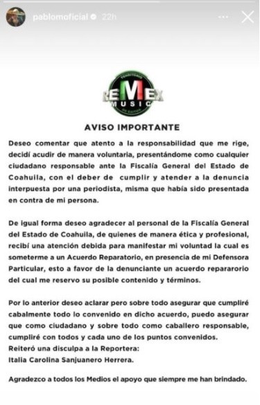 Pablo Montero asegura que acudió voluntariamente ante la Fiscalía General del Estado de Coahuila tras ser denunciado por una reportera que fue agredida por él y por su equipo de seguridad en una conferencia de prensa. Ante una pregunta incómoda para el cantante, la reportera lo cuestionó sobre su alcoholismo, Montero se molestó y le destruyó su equipo de trabajo; en los videos que circula en redes se observa cómo él y su equipo de seguridad se acercan a ella, le quitan el celular y la intimidan.Italia Carolina, reportera del programa "Ventaneando", detalló que tras el maltrato a su equipo de trabajo, no la dejaron salir de inmediato, y la mantuvieron en el lugar en contra de su voluntad. Montero, que no es la primera vez que protagoniza escándalos de este pido, detalló en el comunicado que llegaron a un acuerdo reparatorio del que no dará detalles, y que cumplirá cabalmente todo lo convenido como "caballero responsable", que es, además, se disculpó de nueva cuenta con la periodista."Decidí acudir de manera voluntaria, presentándome como cualquier ciudadano responsable ante la Fiscalía General del Estado de Coahuila, con el deber de cumplir y atender a la denuncia interpuesta por una periodista, misma que había sido presentada en contra de mi persona", se lee.Montero, que recientemente protagonizó la serie "El último rey, el hijo del pueblo" comentó hace unos días, que estaba tomando terapia para combatir su impulsividad, esto, para solucionar las reacciones que ha tenido ante situaciones incómodas o adversas.MF