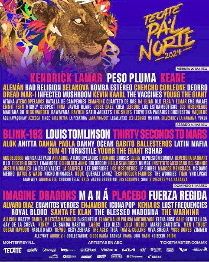 Fiel a su estilo de mostrar una gama "infinita" de géneros musicales en su cartelera, Festival Pa'l Norte anunció el cartel para su siguiente edición, a realizarse en Monterrey, los días 29, 30 y 31 de marzo.Figuran estrellas nacionales e internacionales como Kendrick Lamar, Peso Pluma, Keane, Blink 182, Louis Tomlinson, Thirty Seconds To Mars, Imagine Dragons, Maná, Placebo, Fuerza Regida, y una extensa lista de talento del rock, pop, regional mexicano y hip hop.Sobre la inclusión de diversos géneros, en los que puedes escuchar un rap, y enseguida un corrido tumbado, algunos lo vieron con buenos ojos, y otros fueron críticos con el cartel."Siempre he dicho que ese tipo de festivales es el equivalente a mezclar cereal con jugo de naranja", "parece un Sabadazo", "ya es mucha promiscuidad sonora", "es bueno que haya varios géneros para todos los gustos", comentaron los cibernautas.vll