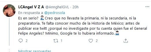 Pedro Sola utilizó sus redes sociales para pedir ayuda en una duda histórica y se ganó las críticas de cientos de usuarios que lo señalaron de ignorante.El conductor del programa de televisión "Ventaneando" afirmó no saber quién es el héroe de la Revolución Mexicana Felipe Ángeles, quien luchó junto al general Francisco Villa. La pregunta surgió luego de que se nombrara así al nuevo aeropuerto internacional del país ubicado en Santa Lucía."Una disculpa por la ignorancia, que alguien me diga quién es Felipe Ángeles. Así le pusieron al aeropuerto nuevo", escribió Sola en Twitter.En este aeropuerto, el día de ayer el presidente López Obrador inauguró la Base Aérea Militar número 1 y conmemoró el Día de la lealtad. Felipe Ángeles también fue director del Colegio Militar en 1912, nombrado por Francisco I Madero y comandante de la artillería de la División del norte.La publicación se hizo controversial pues entre los usuarios de la plataforma hubo quienes lo acusaban de ignorante y flojo por no investigar antes de publicar, pero también los que lo defendieron, argumentando que tenía derecho a tener preguntas y que sólo estaba pidiendo ayuda.El historiador Pedro Salmerón fue uno de los cibernautas que lo cuestionó.Incluso algunos usuarios empatizaron con Sola, y aceptaban que en la educación básica no siempre se enseñaba acerca del General Ángeles. Destacó el comentario del historiador Pedro Salmerón Sanginés, quien quedó sorprendido con la pregunta y generó un nuevo debate.Pedro Sola es licenciado en economía por la UNAM y trabajó en la Secretaría de Hacienda en 1968. Algunos justificaron su ignorancia aludiendo a su carrera.jb