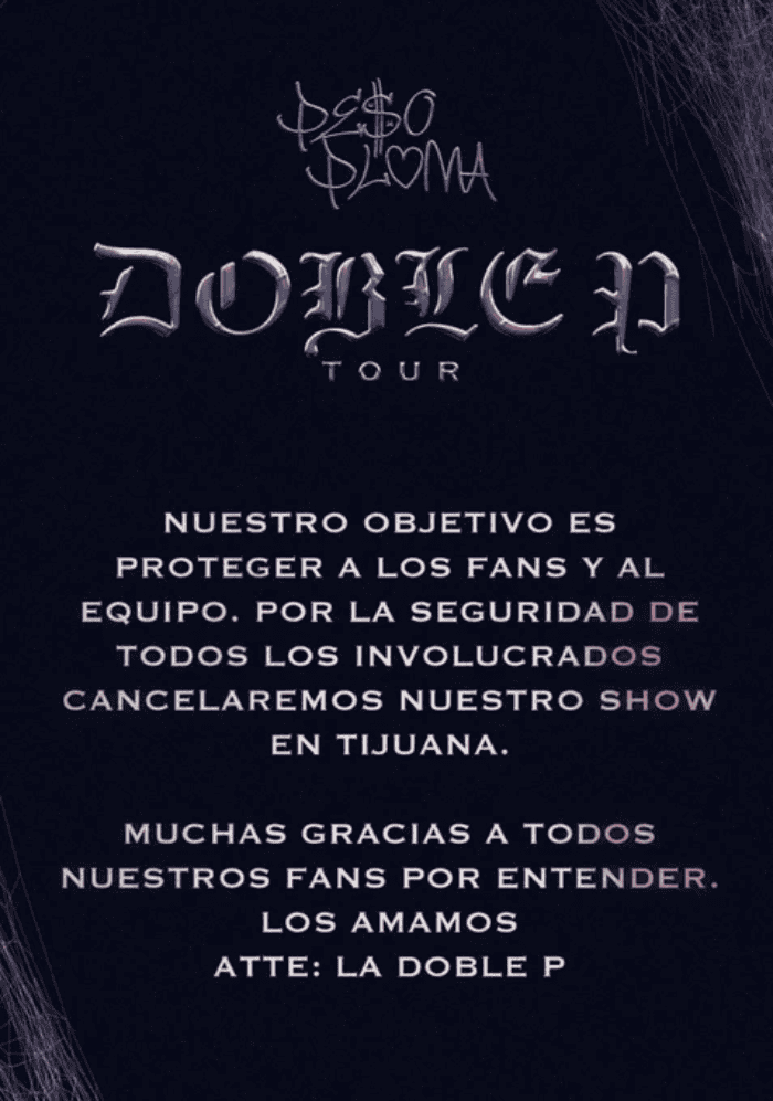 Peso Pluma, el popular cantante tapatío, informó que el concierto que daría en Tijuana el 14 de octubre quedó cancelado luego de que recibiera amenazas de muerte a través de lonas que fueron colgadas en diversos puntos de la ciudad.Las presuntas amenazas, supuestamente firmadas por el crimen organizado, llevaron a que los fanáticos de Peso Pluma le pidieran al cantante que no se arriesgara, y que mejor cancelara el show. Peso Pluma, a través de sus redes sociales, aseguró que lo más importante era la seguridad de todos los involucrados, por lo que agradecía la comprensión de sus fans. "Nuestro objetivo es proteger a los fans y al equipo. Por la seguridad de todos los involucrados cancelaremos nuestros shows en Tijuana. Muchas gracias a todos nuestros fans por entender. Atte: La doble P", se lee. Las lonas advertían al artista que se abstuviera de presentarse en el concierto programado para el 14 de octubre en la ciudad mexicana. La Fiscalía del estado mexicano de Baja California asumió la investigación sobre las amenazas contra el cantante de 24 años.Peso Pluma, conocido por elogiar en sus canciones al narcotraficante mexicano Joaquín "El Chapo" Guzmán, hizo historia el martes pasado al convertirse en la primera estrella mexicana en actuar en los MTV Video Music Awards.FS