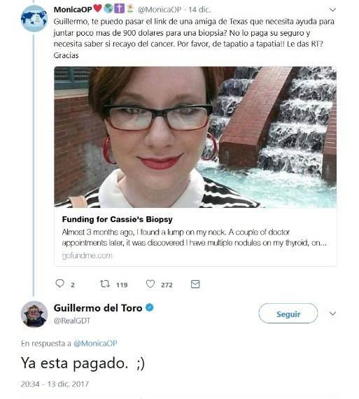Hoy día es común que usuarios en redes sociales acudan a sus estrellas favoritas para pedirles ayuda o un mensaje de aliento en momentos de dificultad, sin embargo en contadas ocasiones obtienen una respuesta positiva, tal como Mónica OP, quien recurrió a Guillermo del Toro para auxiliarla y resultó sorprendida con la respuesta.A través de un tuit, Mónica pidió al nominado a los Globos de Oro que le ayudara a difundir la convocatoria de una campaña de crowdfunding para recaudar fondos destinados a realizar la biopsia de una de sus amigas. Desafortunadamente Del Toro no atendió la petición, sino fue más allá."Guillermo, te puedo pasar el link de una amiga de Texas que necesita ayuda para juntar poco más de 900 dólares para una biopsia? No lo paga su seguro y necesita saber si recayó del cáncer. Por favor, de tapatío a tapatía!! Le das RT? Gracias", escribió la usuaria en su perfil.El también guionista acudió directamente a la página de recaudación y donó el dinero que aún hacía falta, para contestar con un sencillo "Ya está pagado".Maravillados por la respuesta, varios usuarios de Twitter no dudaron en agradecer la muestra del director de "El Laberinto del Fauno" con emotivos mensajes y, por supuesto, Mónica prometió que lo mantendrá al tanto de los resultados de su amiga, quien por su parte apunta que estaba enterada de la petición hasta que fue notificada de que su Crowdfunding ya había alcanzado la meta.AJB.