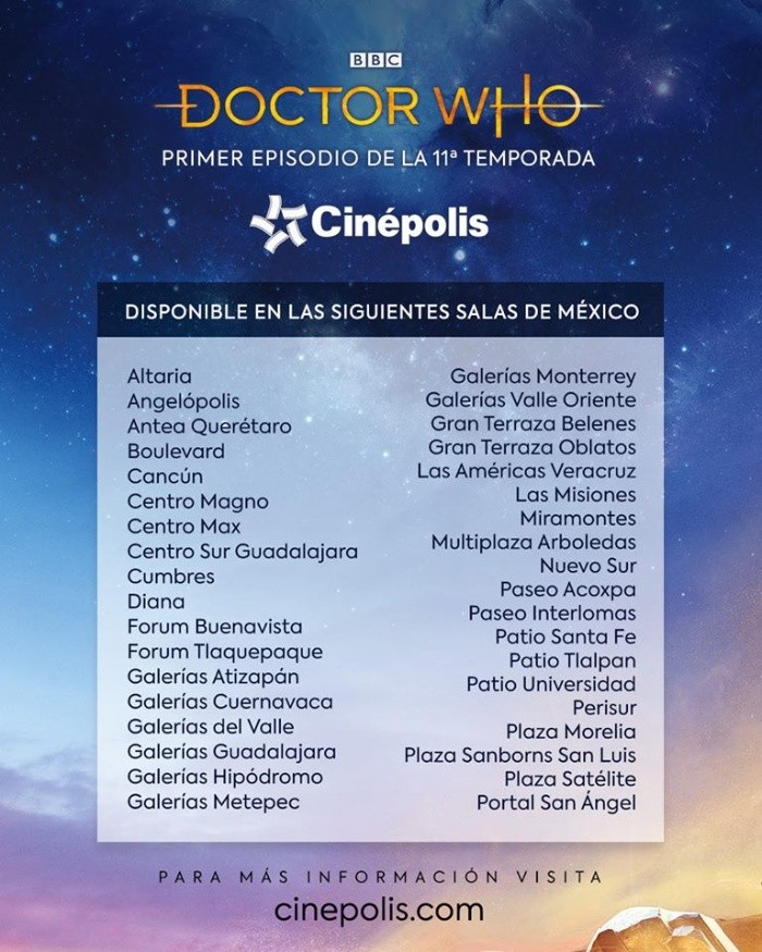 El primer capítulo de la temporada 11 de la serie “Doctor Who” titulado “La mujer que cayó del cielo”, se exhibirá en 100 salas de la cadena Cinépolis en todo el país, el próximo 7 de octubre. En este primer episodio el público conocerá la historia de una misteriosa mujer que cae del cielo para cambiar por completo las vidas de “Ryan Sinclair”, “Yasmin Khan” y “Graham O'Brien”.La casa productora BBC Studios y Cinépolis anunciaron mediante un comunicado en conjunto que los asistentes también podrán disfrutar de contenido inédito que incluye imágenes de detrás de cámaras grabadas durante la filmación de la serie.La actriz Jodie Whittaker es la encargada de interpretar al decimotercer “Doctor”, quien llegará con un nuevo grupo de amigos en esta entrega llena de acción y aventura para toda la familia.“Nos emociona mucho tener esta nueva etapa de ‘Doctor Who’ con Jodie Whittaker en este épico personaje. Estamos seguros de que, con acciones como estas, muchos televidentes que no están tan familiarizados con ‘Doctor Who’ se volverán fans”, declaró David Hanono, vicepresidente de ventas de BBC Studios.AC