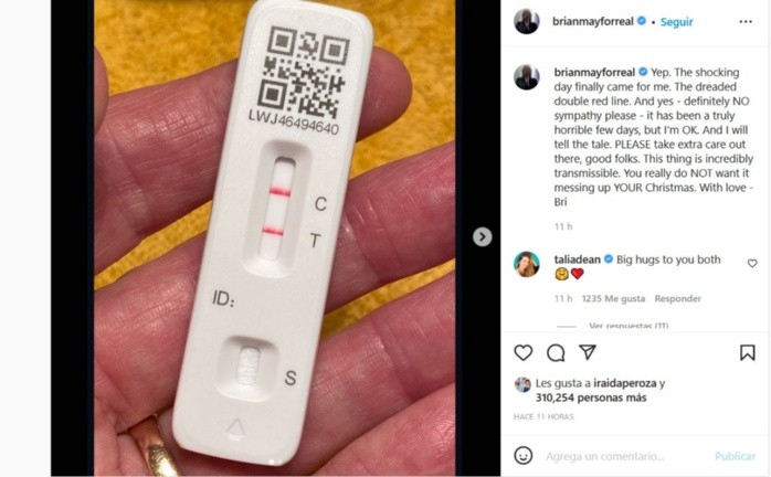 "La temida línea roja. Han sido unos días realmente horribles, pero estoy bien", escribió Brian May, guitarrista de Queen, para anunciar que tiene COVID-19.El músico utilizó sus redes sociales para comunicar la enfermedad con fotos de la prueba positiva. De 74 años, el también compositor inglés pidió a sus seguidores cuidarse mucho, pues el virus es increíblemente transmisible."Realmente no quieres que arruine tu Navidad", redactó, seguida por la frase "Con amor" y su firma, Bri. Su colega músico, Rick Beato, así como la cantante Thalía, han sido algunos integrantes del medio artístico que por Instagram le comunicaron sus mejores deseos para recuperación.Apenas el jueves, May colgó un mensaje agradeciendo un presente navideño, consistente en una pintura de él y su pareja en dos etapas distintas de vida.Brian Harold May, su nombre completo, fundó en 1970 junto con el cantante Freddie Mercury y el baterista Roger Taylor, al grupo Queen, uno de los más dominantes de la escena roquera por la siguiente dos décadas. El bajista John Deacon sería el último en unirse a la banda. May es autor de temas como "We will rock you", "Hammer to fall", "Flash" y "Save me".JM