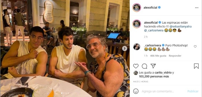 ¡Encienden las redes sociales! Carlos Rivera, Sebastián Yatra y Alejandro Fernández se reunieron en lo que parece ser un restaurante y se tomaron unas fotografías donde miden sus bíceps. Parece ser que el menos favorecido es Yatra, pues Carlos y Alejandro presumieron sus muy torneados y tonificados “conejos”.Alex posteó “Las espinacas están haciendo efecto”, mientras que Carlos Rivera expresó en su cuenta de Instagram que el que ganó la competencia fue “El Potrillo”, “pero al menos no quedé en último (lugar)”, refiriéndose a que Yatra en esta competencia tenía las de perder.Por otro lado, Yatra le preguntó a su público que le dijeran la verdad, “¿Quién ganó?”. No se sabe si esta reunión fue para desarrollar algún proyecto juntos como alguna colaboración o gira, pero se nota que se divirtieron mucho y que hay una buena amistad entre los tres. Posiblemente en unos días más se dará la noticia del porqué de esta reunión.JM