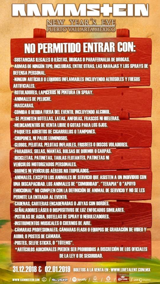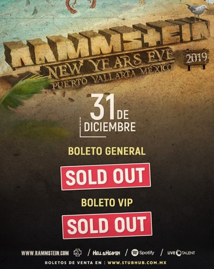 Luego de 2 años de ausencia, Rammstein vuelve a México para despedir el 2018 y recibir el 2019 con un par de shows en las paradisiacas playas de Puerto Vallarta, Jalisco.Los shows serán los días 31 de diciembre y 2 de enero. La venta de boletos es a través de StubHub.Boletos por día de concierto Boleto General: $225 USD Boleto VIP: $395 USD(Incluye una sección exclusiva para mil personas, donde podrás disfrutar de un Lounge Bar con lo mejor en coctelería nacional e internacional -bebidas no incluidas-, una cómoda zona confort en área de playa, además de una plataforma elevada para una mejor vista, zona de carga de celular, baños premium, entrada preferencial y estacionamiento exclusivo)Paquetes Premium: PLATINO Platino Sencillo: $3,698 USD (Habitación Sencilla en Secrets Bay Vallarta todo incluido por 4 noches, abono Vip para las 2 noches de Concierto con Rammstein) Platino Doble: $6,564 USD (Habitación Doble en Secrets Bay Vallarta plan Todo incluido por 4 noches para 2 personas, abono VIP para las 2 noches de Concierto con Rammstein)Secrets Bay VallartaPaquetes Dorado: Dorado Sencillo: $3,194 USD (Habitación Sencilla en Now Amber Hotel, todo incluido por 4 noches, abono General para las 2 noches de Concierto con Rammstein) Dorado Doble: $5,292 USD (Habitación Doble en Now Amber Hotel, todo incluido por 4 noches más abono General para las 2 noches de Concierto con Rammstein) Now Amber Hotel(Tanto el hotel Secrets Bay como el Now Amber se encuentran a un lado del Venue donde se llevara acabo el concierto de Rammstein)Alta demanda de boletosCada uno de los conciertos tendrá capacidad para 5 mil personas; 4 mil en zona general ( $225 USD) y mil vip (395 USD) mismos que levantaron una ola de comentarios debido a su alto costo. "En México sí hay dinero, esta es la prueba, estamos seguros que será un sold-out. Será un concierto en el que podremos escuchar por primera vez en vivo sus nuevas canciones y sus grandes éxitos, será un espectáculo único en la historia de México y de Rammstein". Para su primero recital, ese que se llevará para recibir el año nuevo, las localidades tanto general como vip se encuentran ya agotadas, sólo quedan algunos accesos para el 2 de enero.Nuevo disco, casi listo16 de octubre de 2009, fue el día es que se editó 'Liebe Ist Für Alle Da' (El amor está ahí para todos) el último álbum de Rammstein, si bien un par de años después se lanzó un disco compilatorio que contenía el mencionado tema 'Mein Land' y este 2017 un nuevo disco en directo desde Paris, los fans están ansiosos de escuchar nuevo material, mismo que ya está en su etapa final, una que incluye arreglos de orquesta y coros, así lo dio a conocer la propia banda a través de sus redes sociales, a la vez de afirmar que la nueva placa podrá ser disfrutada en el primer trimestre del 2019.
