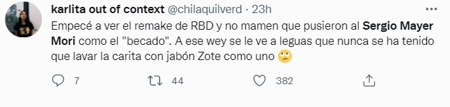 El estreno de "Rebelde" tiene en tendencia a los actores de esta nueva adaptación. Sergio Mayer Mori ha generado diversas reacciones de los fanáticos y nuevos seguidores del proyecto.Su papá Sergio Mayer no es la excepción, además estar muy contento porque su hijo se encuentra en esta nueva versión de la famosa telenovela, para él fue extraño ver a su hijo hacer escenas de sexo en la serie."Estoy muy contento, muy satisfecho con su trabajo en 'Rebelde'. Lo que sí pasa es que me pone nervioso de risa las escenas sexuales que tiene. Ese tipo de escenas no son fáciles para ningún actor y verlo a él, imagínate, me pone muy nervioso", explicó el exdiputado federal.El actor ya ha expresado su admiración y respeto por el proyecto de su hijo, tal es el caso de su publicación en Instagram donde presume a su nieta Mila Mayer y la nota de una revista de moda sobre "Rebelde", que acompañó con el mensaje "Así o más orgullosa, su mejor regalo de reyes".En cuanto al tema de que su hijo odiaba "Rebelde", Mayer comentó que ya todo está olvidado y que su primogénito ya pidió disculpas por lo sucedido.Mayer Mori aseguró, a través de sus redes sociales a mediados del año pasado, que si él interpreta música de RBD es por contrato porque nunca ha sido fan, unos días después se disculpó a través de un posteo en redes sociales.Otras reacciones no tan favorables son las que hay sobre que el papel de Mayer Mori no es el adecuado porque el público no cree que él conozca la pobreza. Sergio interpreta a Esteban, un chico de clase media que es becado en la escuela Elite Way School.El actor considera su personaje como bueno, fuera de la norma de lo que es esa escuela porque la gente de ahí tiene dinero. Este papel ha molestado a varios usuarios en Twitter."Empecé a ver el remake de RBD y no mamen que pusieron al Sergio Mayer Mori como el 'becado'. A ese wey se le ve a leguas que nunca se ha tenido que lavar la carita con jabón Zote como uno", se lee en una publicación en Twitter.AF