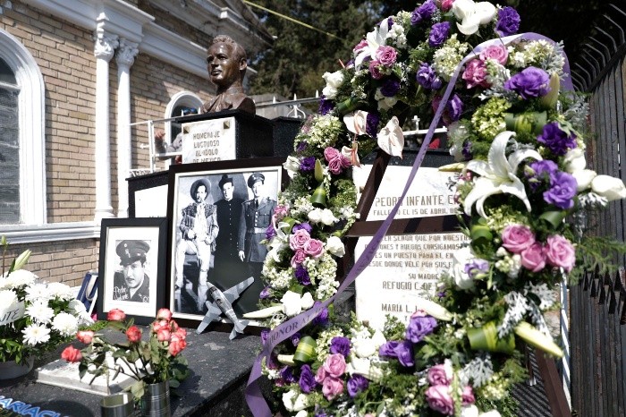 Imitadores del "Ídolo de Guamúchil", suvenires (como paquetes de taza, tequilero y pluma por 50 pesos) y hasta dos cráneos enormes en honor a Pedro Infante fueron parte del homenaje que el actor recibió en el Panteón Jardín por su aniversario luctuoso número 62.Desde las .9:00 horas de ayer 15 de abril, cientos de seguidores del icono del cine de oro de México se reunieron para ser parte de la conmemoración por la vida del actor mexicano. La hija del actor, Lupita Infante Torrentera llegó acompañada de otros integrantes de la familia y miembros de la Confederación Internacional de Motociclistas y Policías de Caminos (CIMOPC)."Cada año están aquí todos sus seguidores y los que se van agregando que cada vez son más. No tengo cómo agradecerles tanto cariño y amor hacia mi padre. Él sigue vivo gracias a ustedes y estoy segura que mientras existan, nunca morirá", contó Lupita Infante.Entre las actividades significativas que se realizaron, hubo una misa, música de mariachis y la develación de dos "Mexicráneos", piezas conmemorativas que hacen honor a los personajes a los que el actor dio vida y que patrocina la funeraria García López.Frente a la tumba del actor, los seguidores entonaron canciones que lo hicieron famoso, como "Amorcito corazón", "Cien años" y "No volveré"."Lo vi cantando la de ‘No volveré’ y conseguí su autógrafo, pero se me perdió con el tiempo. Sin embargo, aquí estoy como cada año, no lo olvido, me sé todas sus canciones y lo recuerdo como una gran persona", dijo Aurelio Jiménez, quien a los 12 años conoció a Pedro Infante.OA